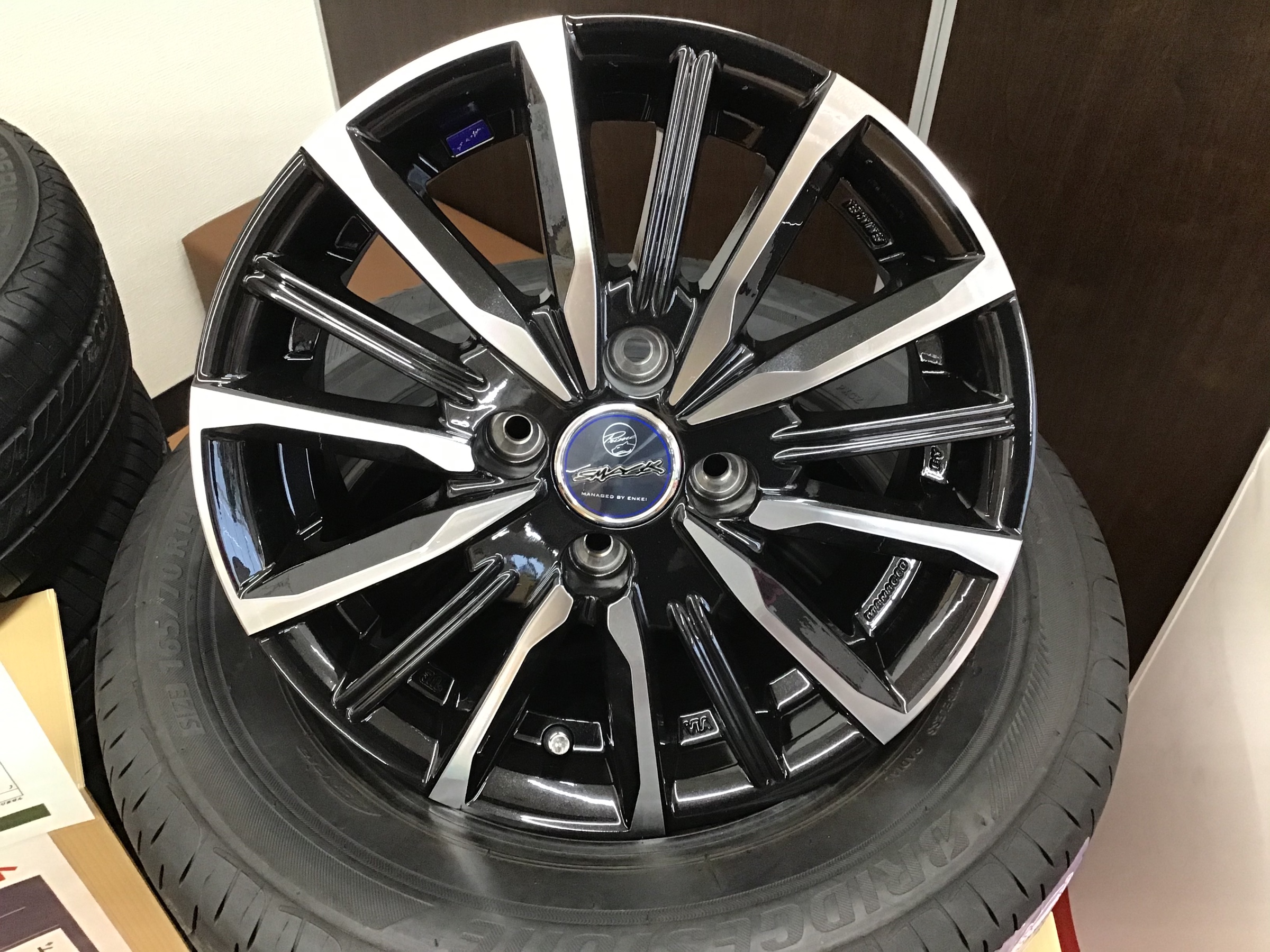 スタッドレスタイヤ&アルミホイールセットの取り付けとアライメント調整です。 取り付けた商品はこちらです。 タイヤ→ブリヂストン VRX2 195/65R15 ホイール→ブリヂストン エコフォルム SE-15 こちらはアライメント調整中の宮川君です。 いつになく真剣な顔で作業しています。
