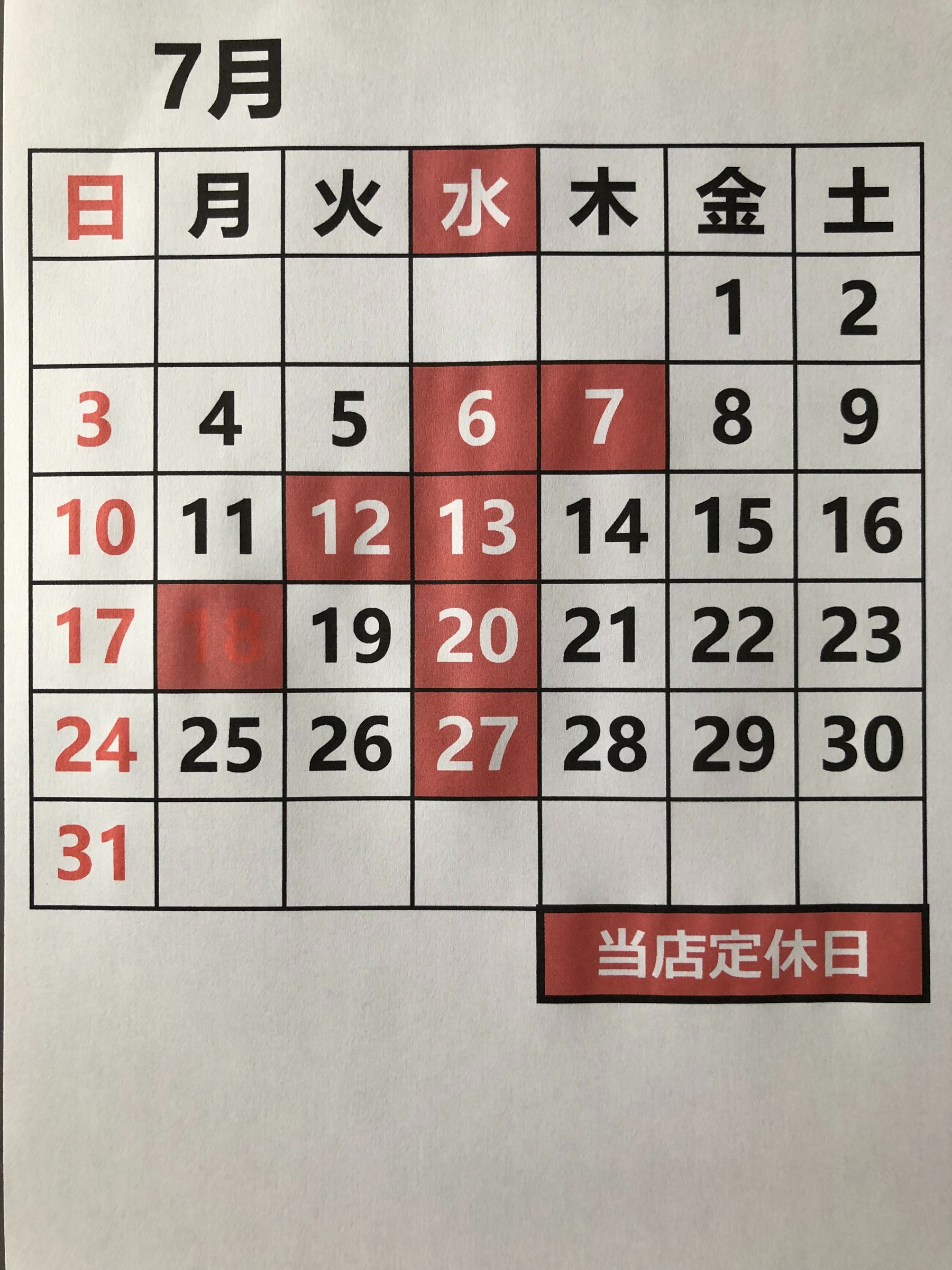 7月定休日のお知らせ ポスト 2022年7月3日 いつも当店をご利用頂き、誠にありがとうございます。 7月の定休日をお知らせいたします。 ご不便おかけしますがよろしくお願いいたします。 カテゴリ:お知らせ