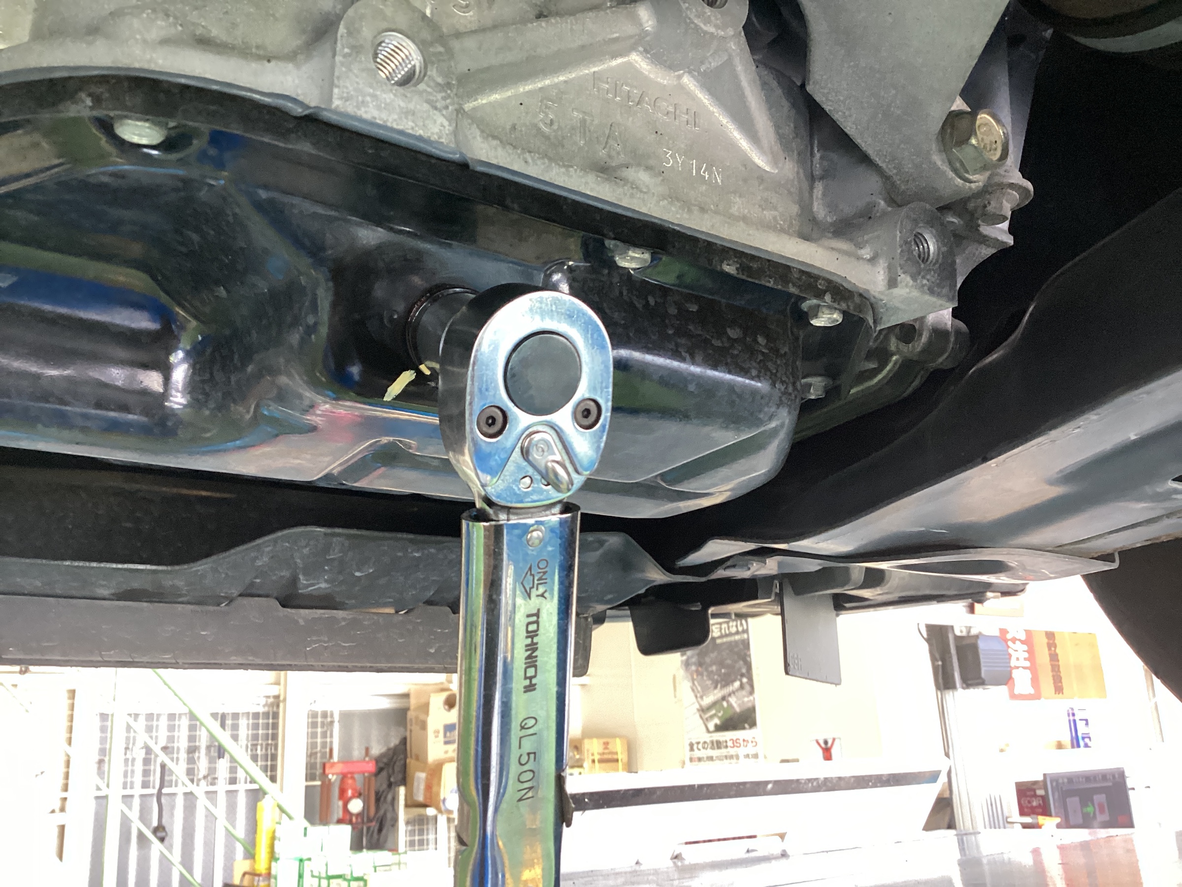 タイヤ館ではオイル交換も当たり前ですがトルクレンチで確実に締めます。