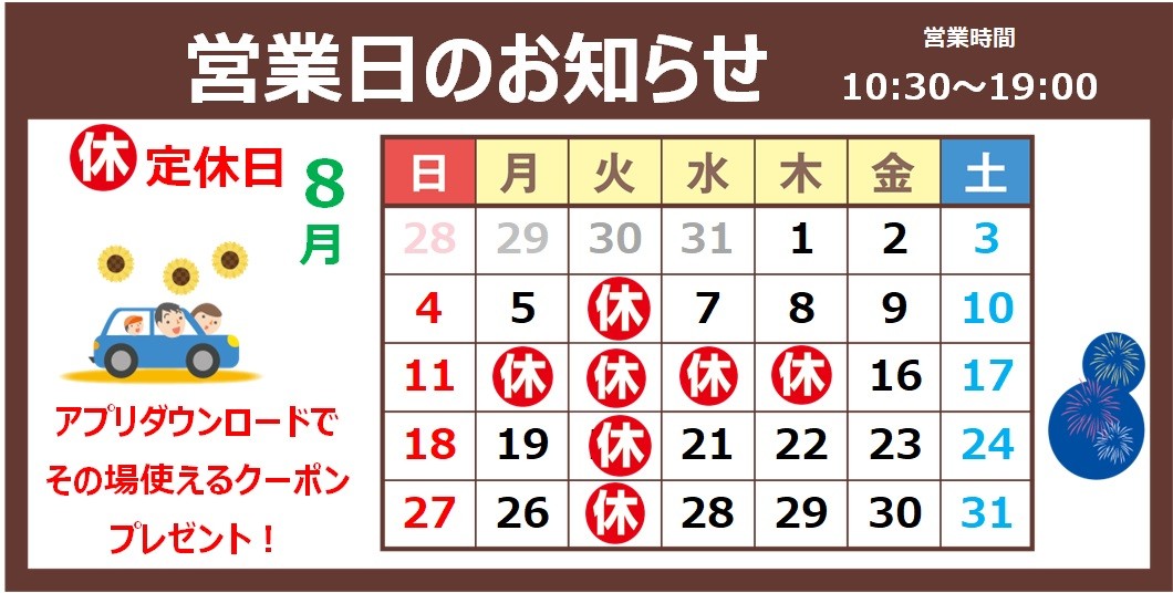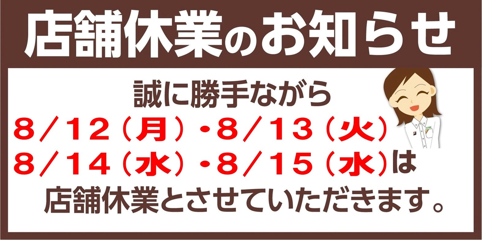 8月定休日のお知らせ 2024年8月1日 8月の定休日は、6日、13日、20日、27日の火曜日と12日、14日、15日です。 ご来店希望のお客様はお間違えの無いようご注意ください。 営業時間は、 10:30~ 19:00 となっております。 午前中ご来店のお客様はお気をつけください。 パンクのトラブルなど緊急のお客さんで時間に間に合わないお客様は、 事前にご連絡ください。 皆様のご来店お待ちしております。 〒013-0060 秋田県横手市条里二丁目3-26 タイヤ館横手 電話番号:0182-33-7744