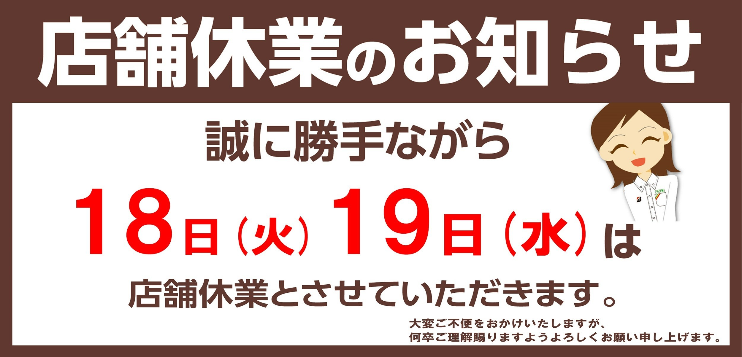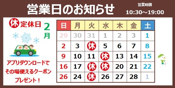 2月営業日変更のお知らせ 2025年2月1日 いつもタイヤ館横手店をご利用いただきありがとうございます。 2月の営業日変更のお知らせです。 18日.19日と定休日となっておりますのでご了承ください。 ご来店希望のお客様はお間違えの無いようご注意ください。 営業時間は、 10:30~ 19:00 となっております。 午前中ご来店のお客様はお気をつけください。
