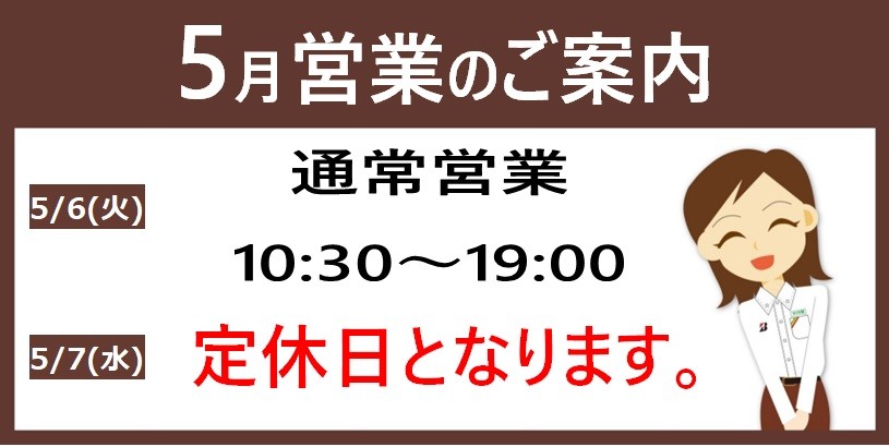 5月は、6日(火)は営業させていただき7日(水)お休みさせていただきます。