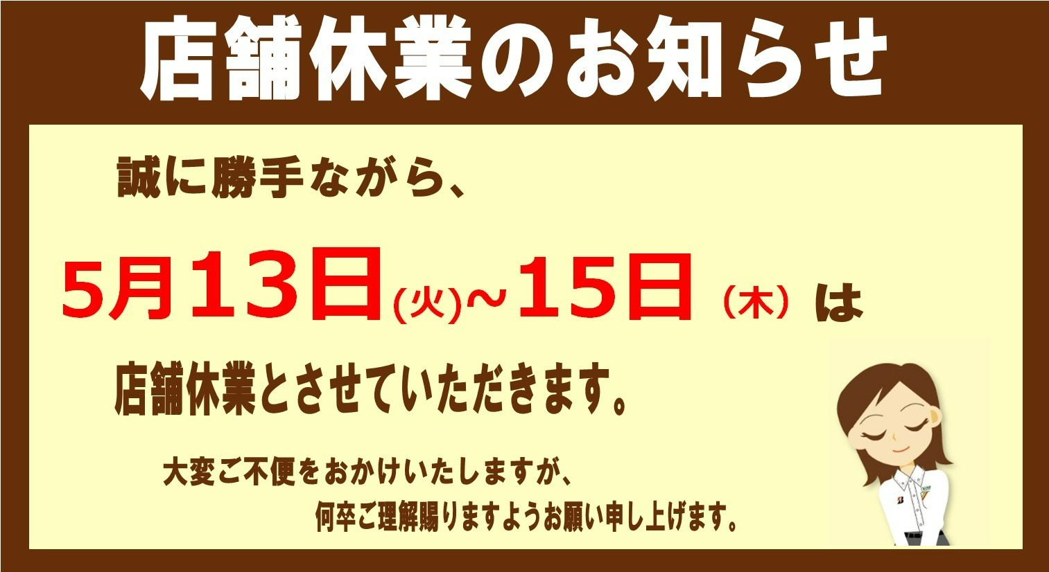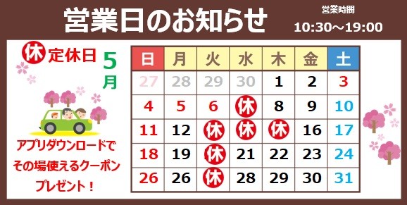5月は、6日(火)は営業させていただき7日(水)お休みさせていただきます。