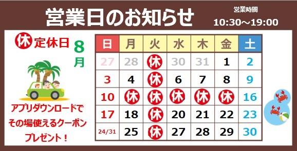 8月の定休日は、5日、12日、19日、26日の火曜日と11日、13日、14日、15日です。