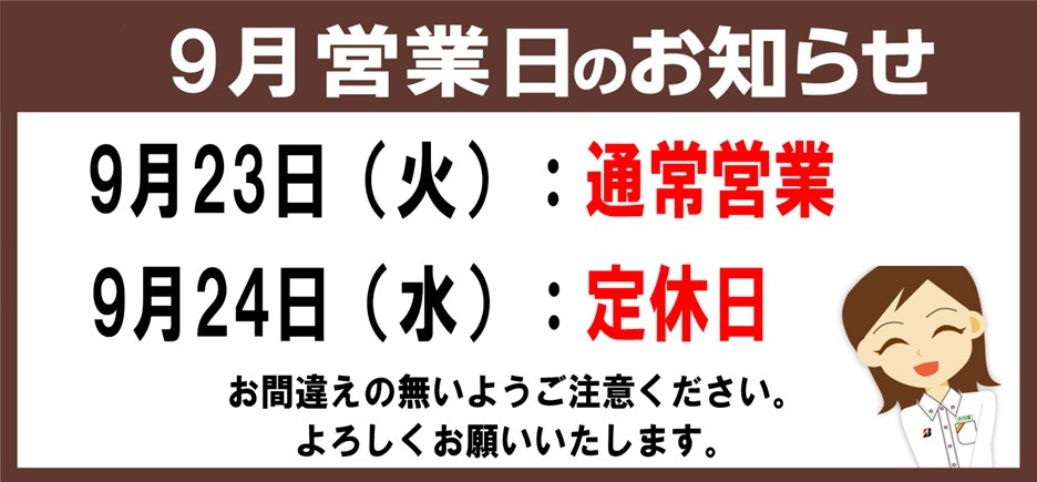 9月営業日のお知らせ【9/23は火曜日ですが営業日となります!!】 2025年9月22日 いつもタイヤ館横手をご利用いただきありがとうございます。 9月の営業日についてのお知らせです。 9/23(火):通常営業 9/24(水):定休日 となります。 大変ご不便をおかけしますが、 何卒ご理解賜りますようお願い申し上げます。