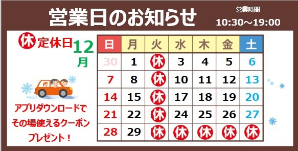12月の定休日は、2日、9日、16日、23日、30日の火曜日と31日の水曜日です。