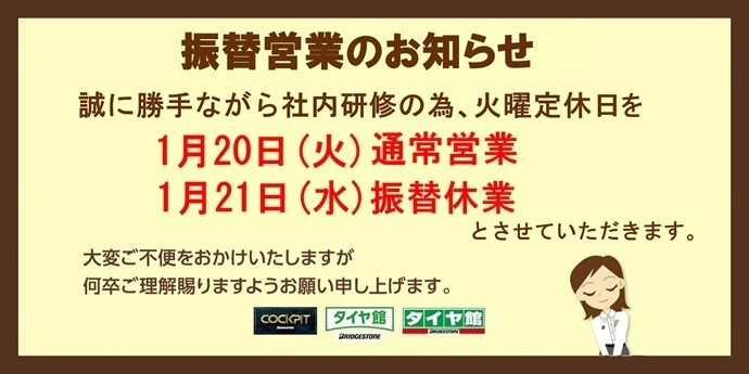 1月営業日のご案内 ※振替休業 2026年1月7日 いつもタイヤ館横手を ご利用いただきまして誠にありがとうございます。 社員研修のため、 20日火曜日を通常営業とし21日水曜日を振替休業とさせていただきます。 ご不便をおかけしますが、ご理解のほどお願い致します。 皆様のご来店を心よりお待ちしております。