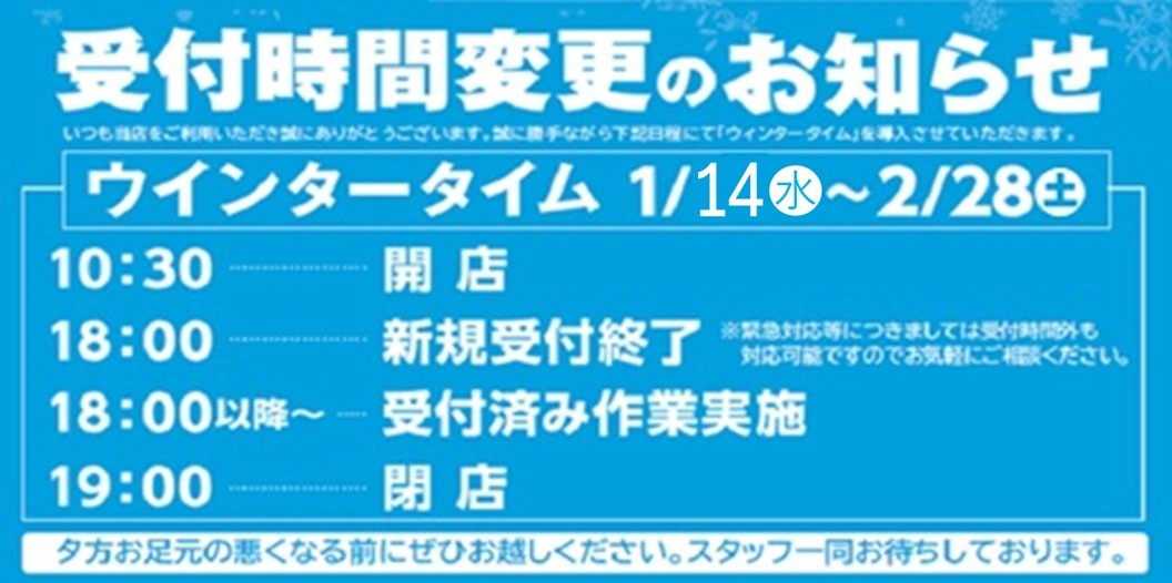 誠に勝手ながら 1月14日(水)から2月28日(土)まで 受付時間の変更(ウィンタータイム)を導入させていただきます。 期間内各種時間 10:30・・・・・開店 18:00・・・・・新規受付終了 18:00以降・・・受付済み作業実施 19:00・・・・・閉店 なお、パンク等の緊急対応につきましては受付時間外も対応可能ですのでお気軽にご相談ください。 受付時間中のご来店をスタッフ一同お待ちしておりますm(_ _)m
