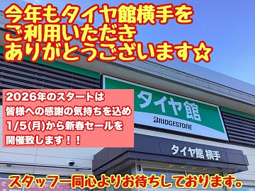 今年1年当店をご利用いただき 誠にありがとうございました。 スタッフ一同心より感謝申し上げます。 来年は、より一層の安心と安心を提供できる専門店を 目指していきたいと思います! お困りごとはタイヤ館横手にご相談ください!! タイヤ館横手は12/30~1/4まで お休みをいただきます。 1/5より...