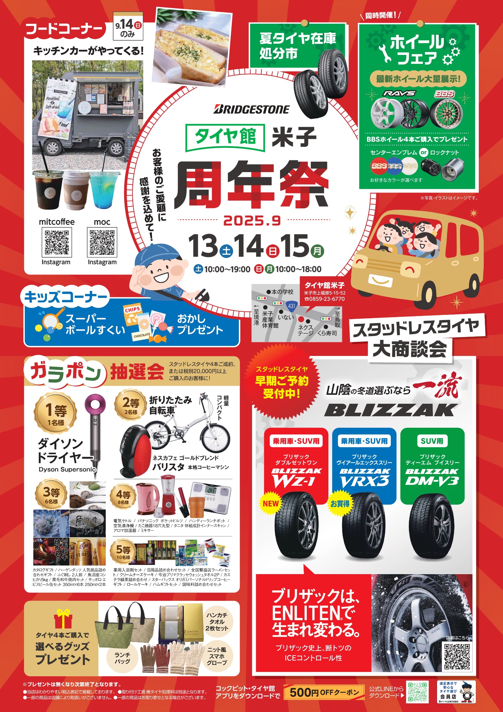 ☆周年祭☆開催! ポスト 2025年9月10日 今年でタイヤ館米子もリニューアル7年目を 迎えることができました。 日頃お世話になっている皆様に感謝の気持ちを込めて 1年に1度の大感謝祭「周年祭」を開催致します。 ※ブリザックについて詳しくはブリヂストンホームページをご覧ください。 9月13日(土)から9月15日(月)まで 期間中は周年祭ならではのお得な特典をご用意!! スタッフ一同皆様のご来店、心よりお待ちしております。