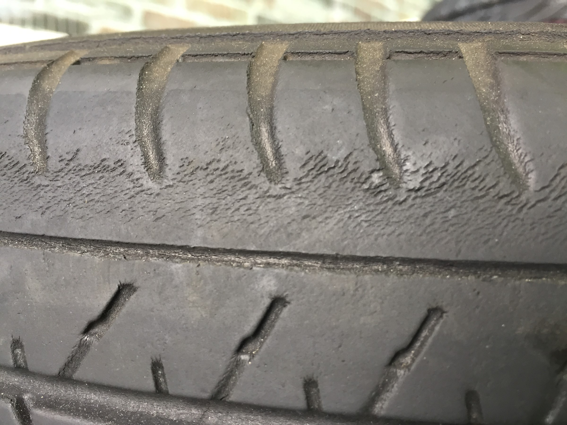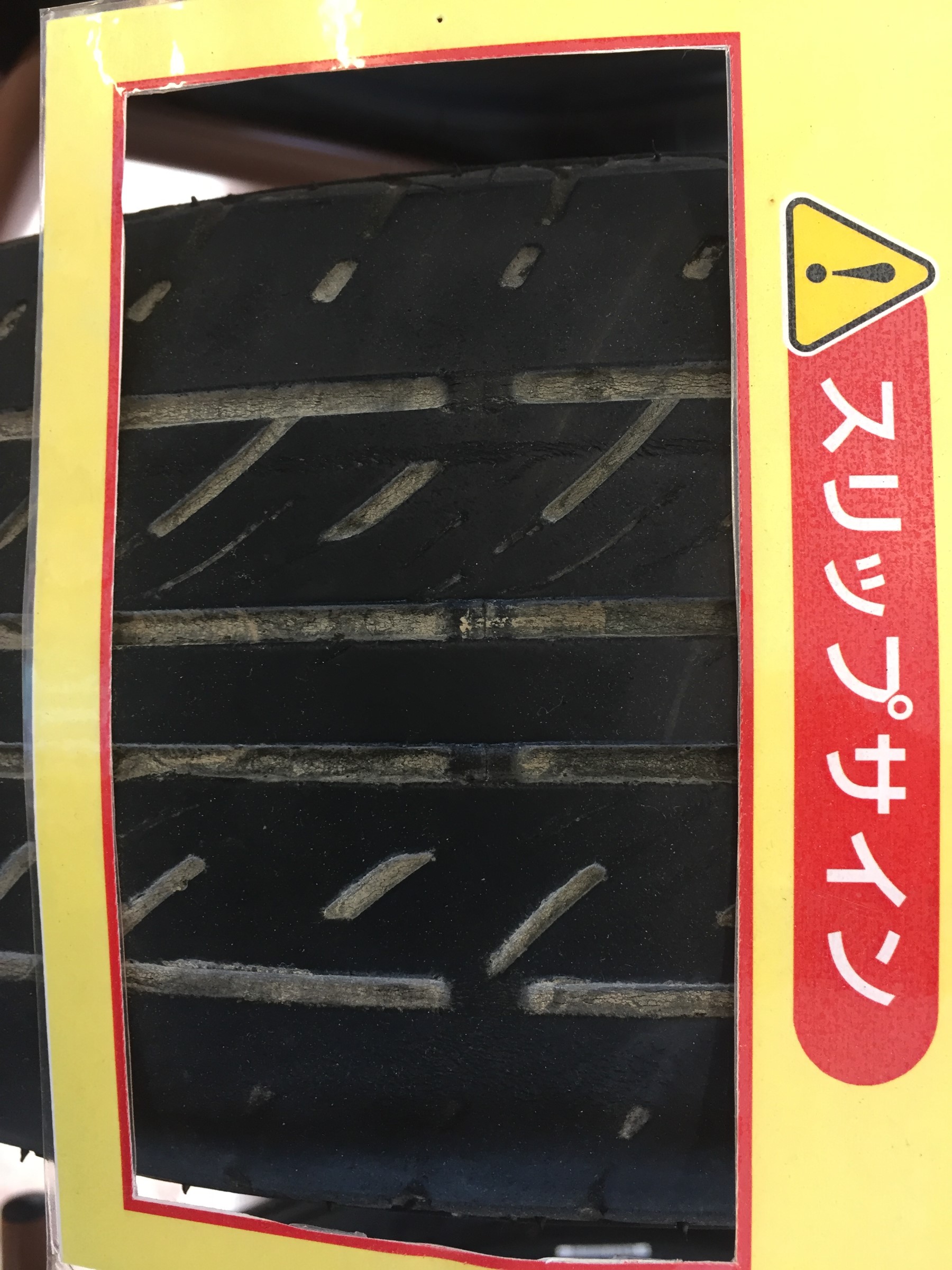 タイヤにはスリップサインという出っ張った目印があるのですが、ここまで減ると文字通り『ここまで減るとスリップするからもう使えませんよー』というサインで、車検も受からなくなり、整備不良車両になります。