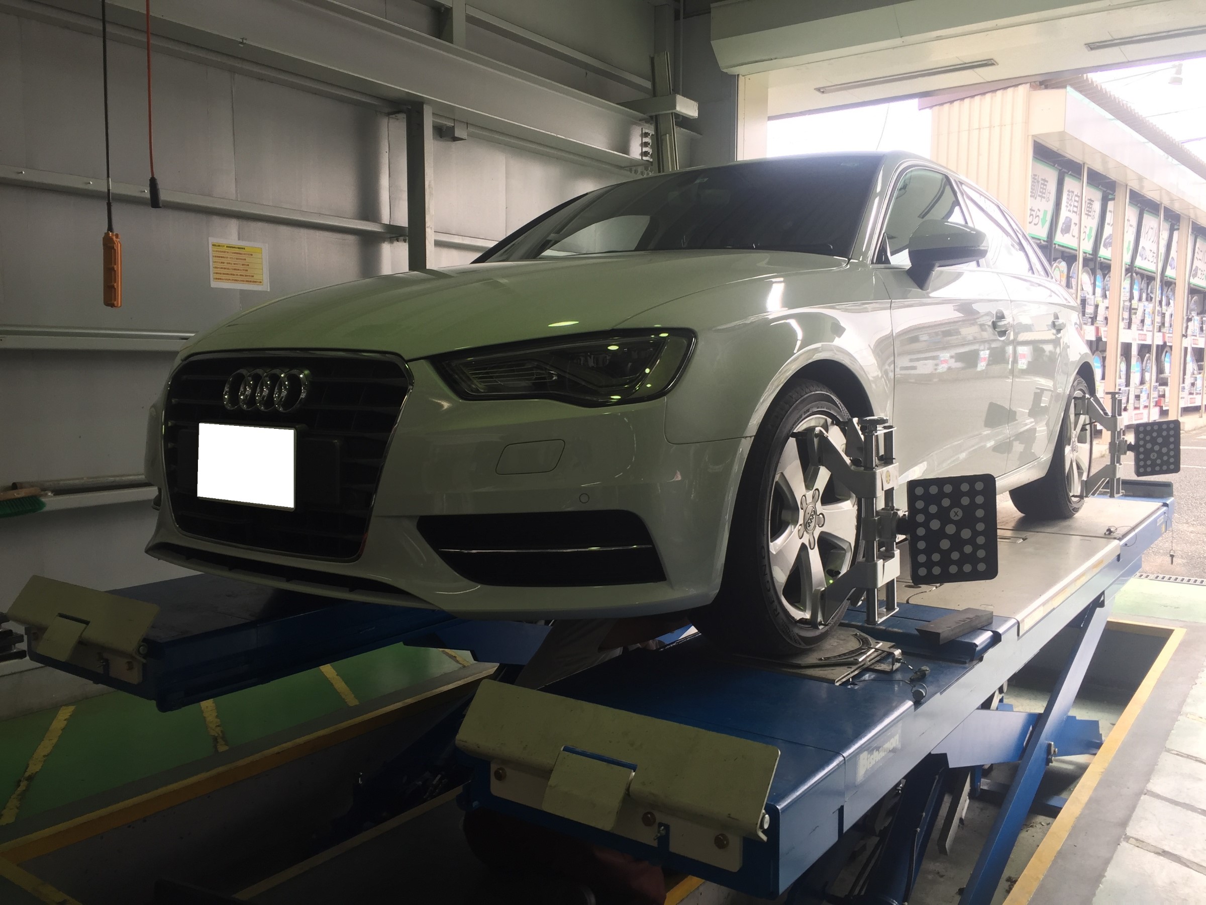 続いてご来店のAUDI A3、こちらは100km点検とアライメント作業を行いました!