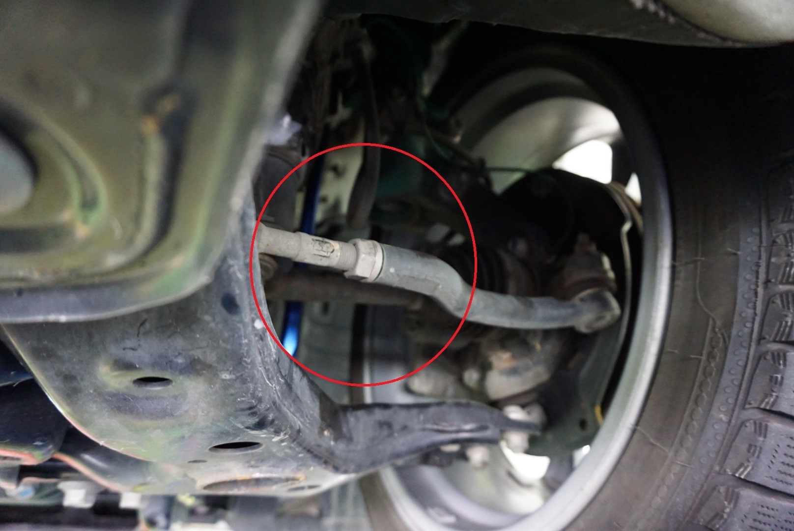 フロントは上の画像の赤丸のタイロッドと呼ばれる部品で調整していきます。