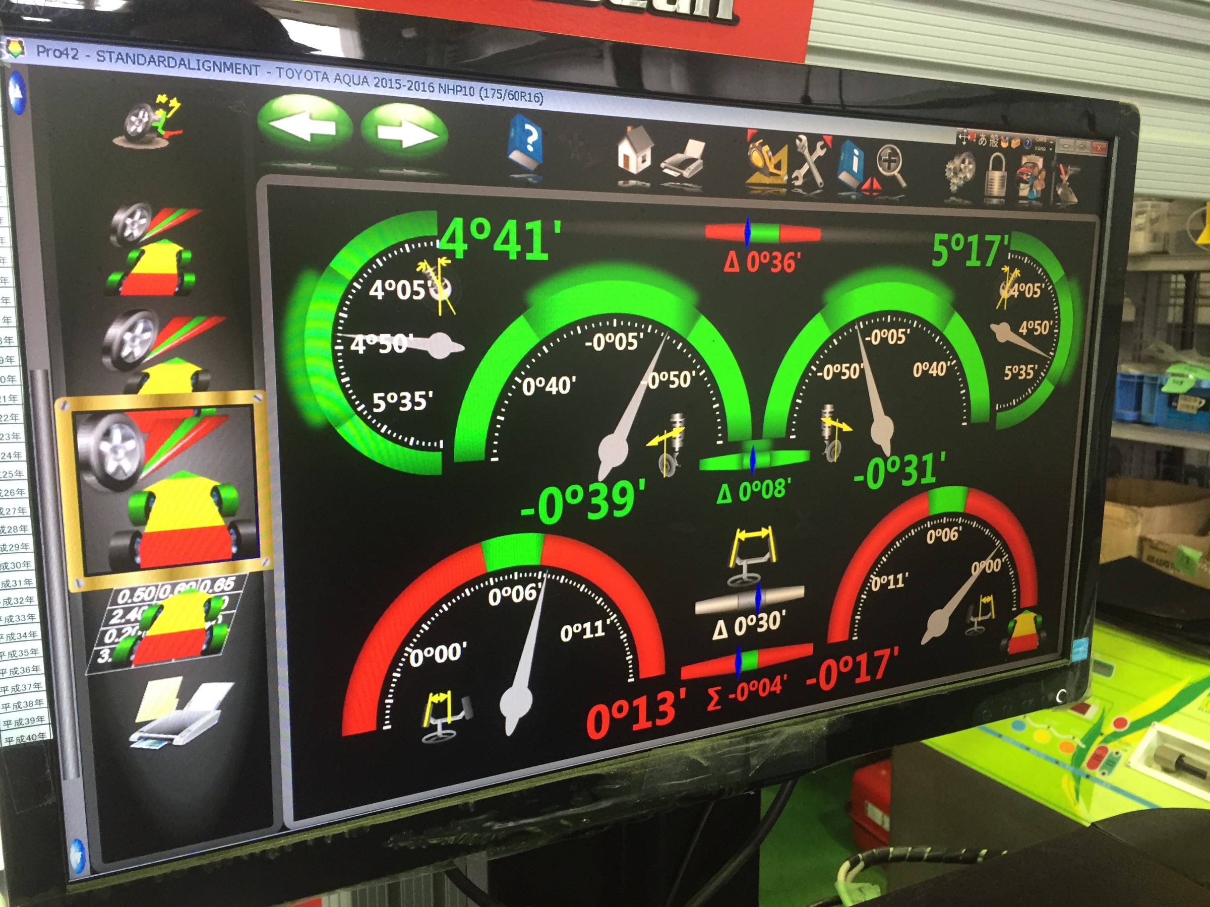 ↓ フロントの測定結果です。赤い数字は基準値外を現しており、調整する必要があります。
