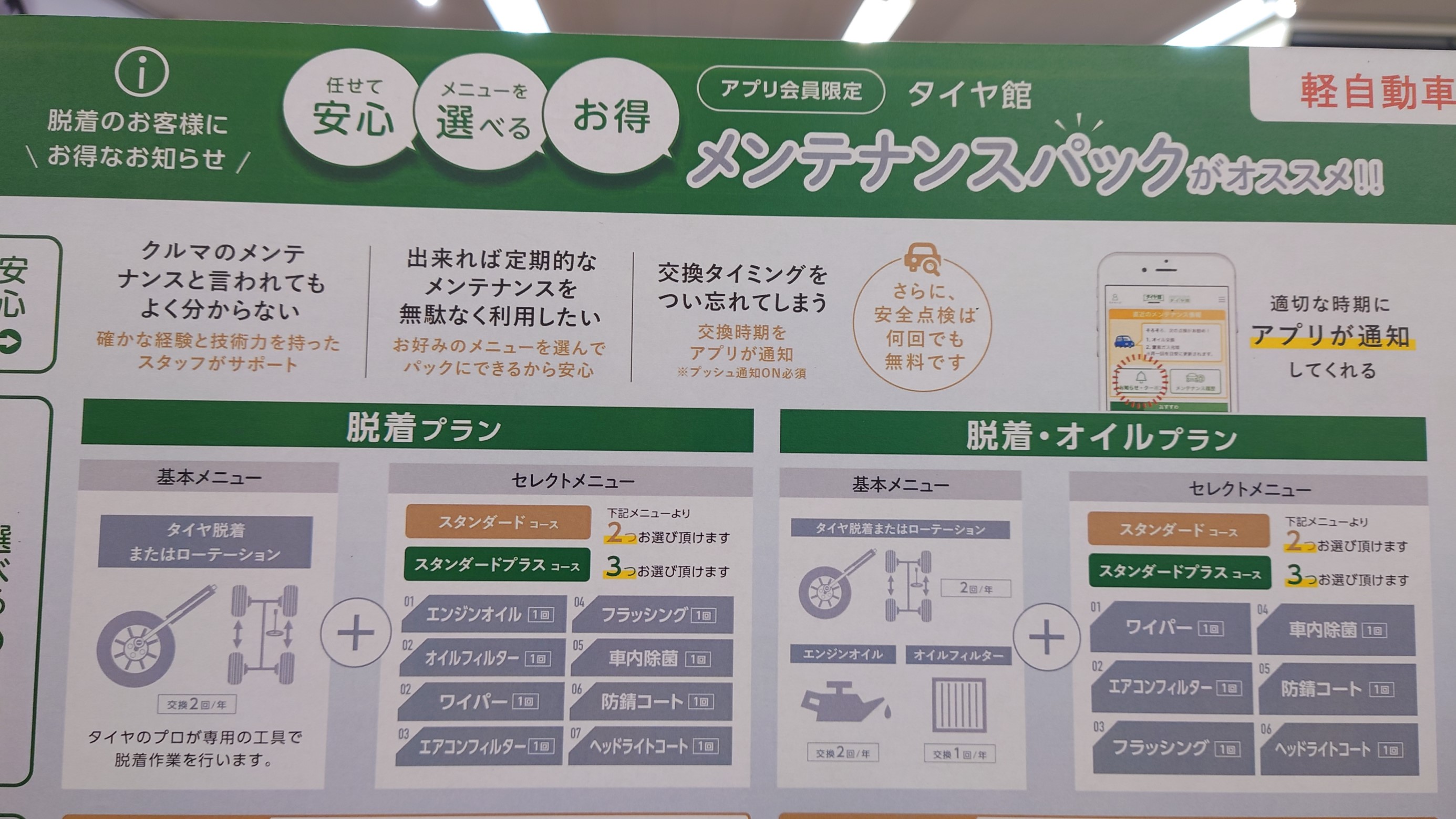 この新メンテナンスパック、『タイヤ館アプリ』との組み合わせで利用可能になります。
