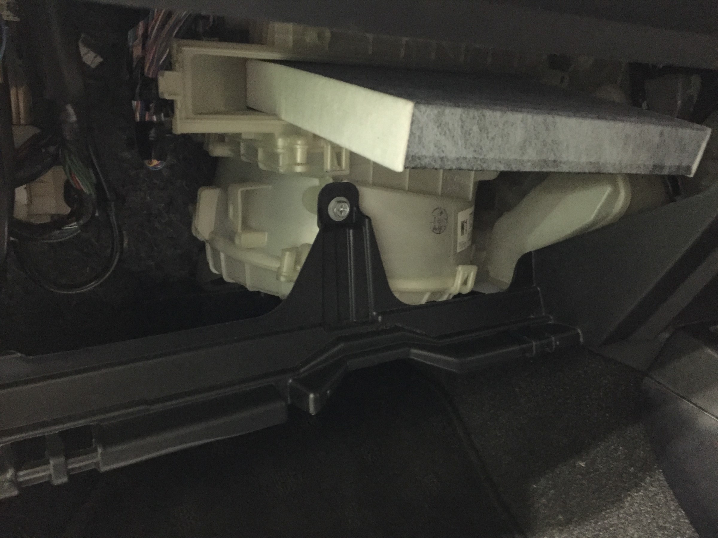 グローブボックス・エアコンフィルターを外し、抗菌クリーンの薬剤のスプレー缶と繋げたチューブをエアコンブロワー内部に挿入し、スポンジでフタをします。