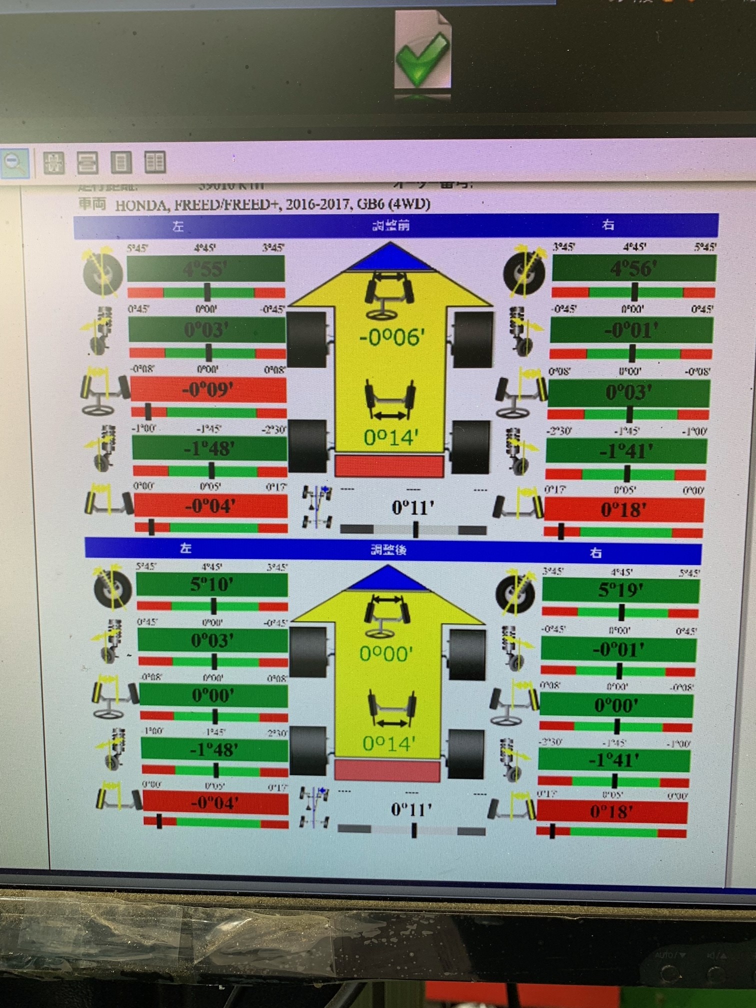 ↓ データはこんな感じです!上のデータが調整前で下のデータが調整後のデータです。左前のタイヤ軸が11時の方向に傾いています!しっかり調整!