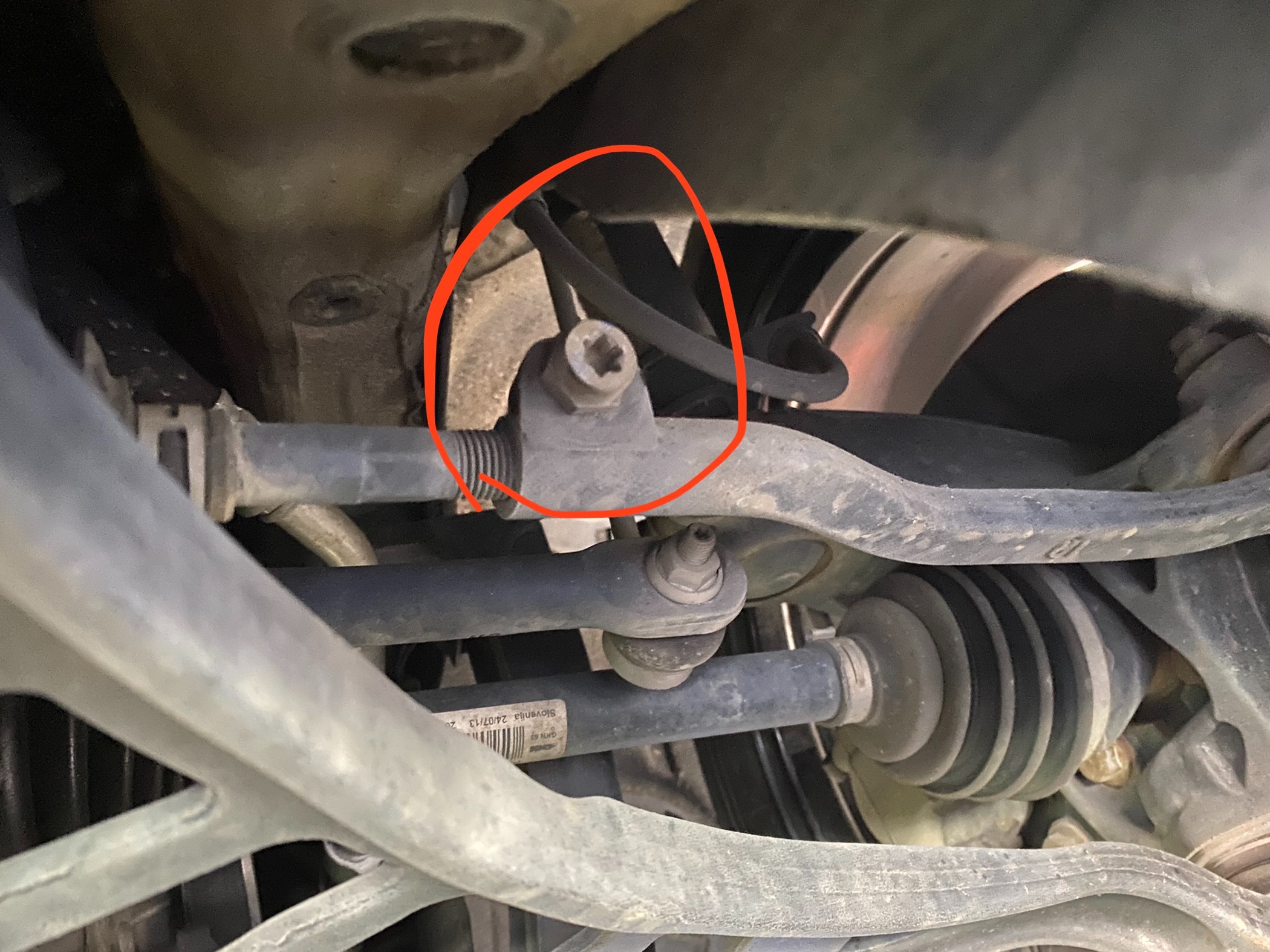 国産車とはちょっと違いますが、赤丸部分を緩めてタイロッド部分を動かすことでトーが調整できます。