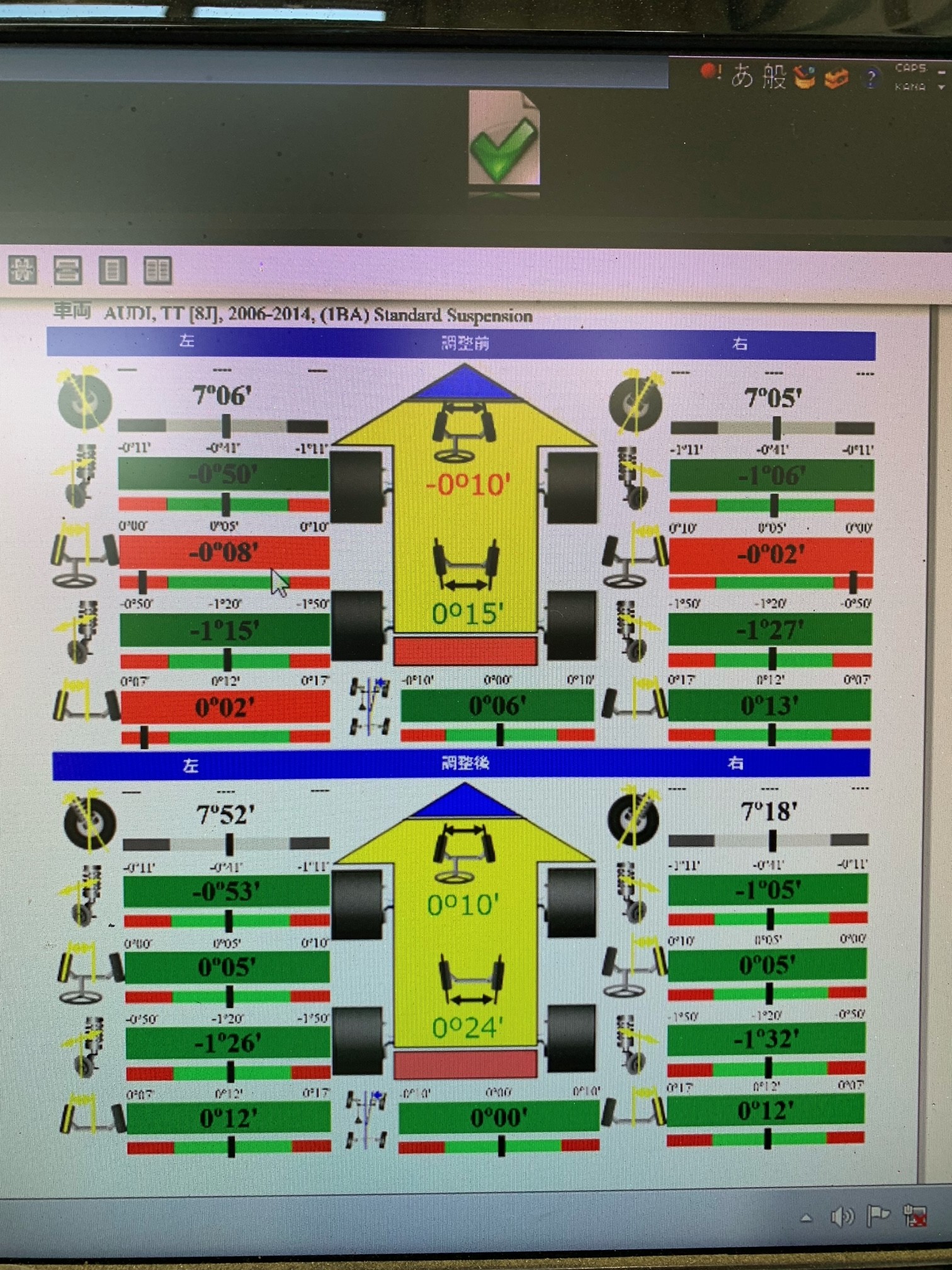 ↓ 足回りのパーツをいじっているのでアライメントデータは大きくズレてましたのでしっかり調整しました。