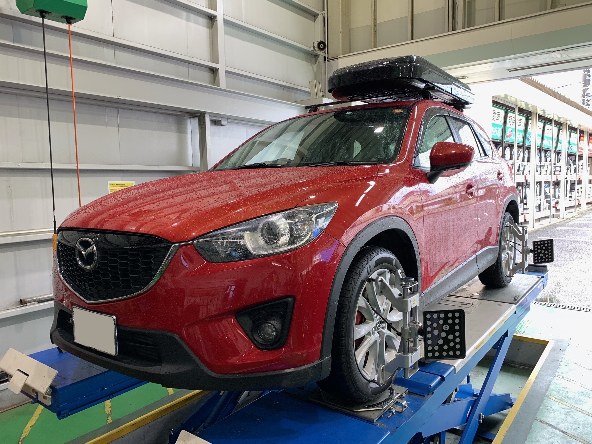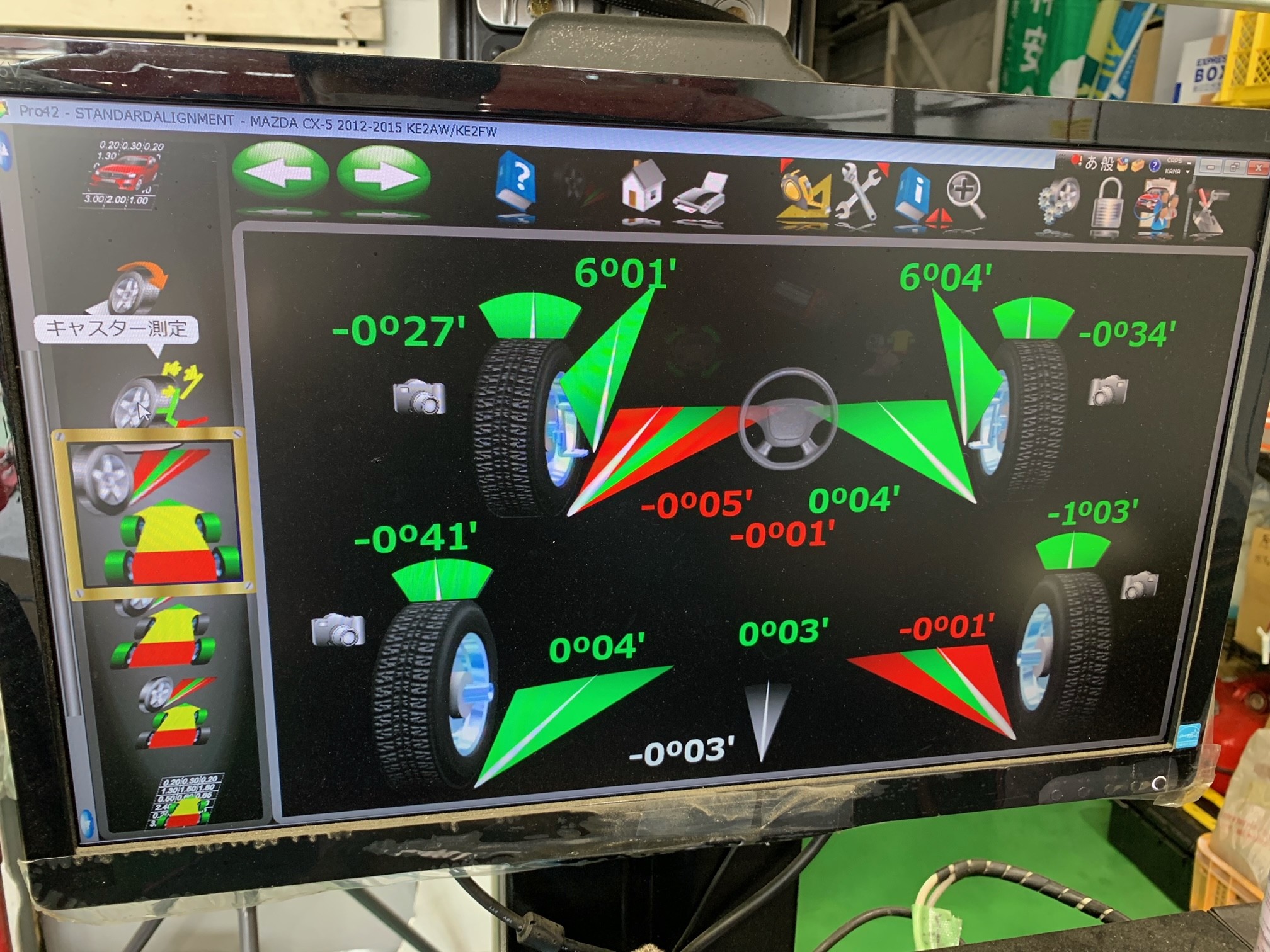 ↓ アライメントデータはこんな感じです。左前タイヤの軸と右後タイヤの軸が許容範囲からオーバーして赤くなっております。しっかり調整致します。