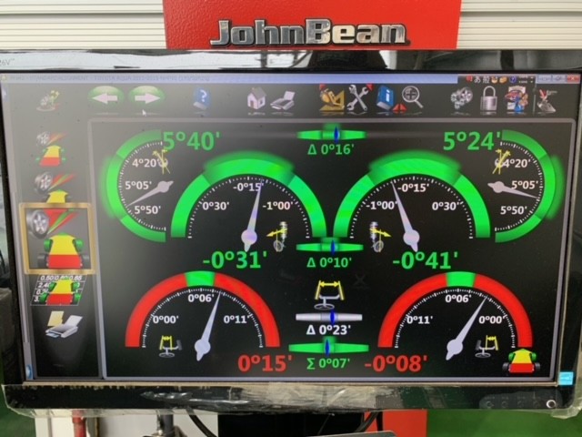 ↓こちらがアライメント調整前のデータ。タイヤの軸が右にズレていますね。