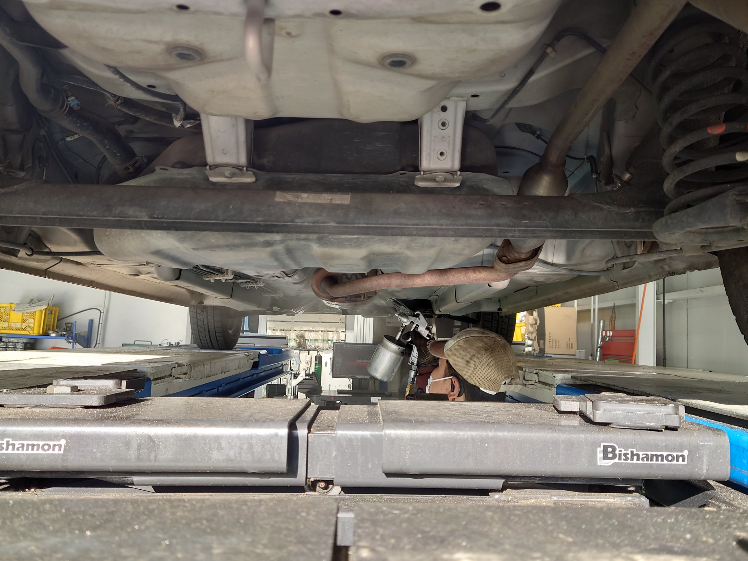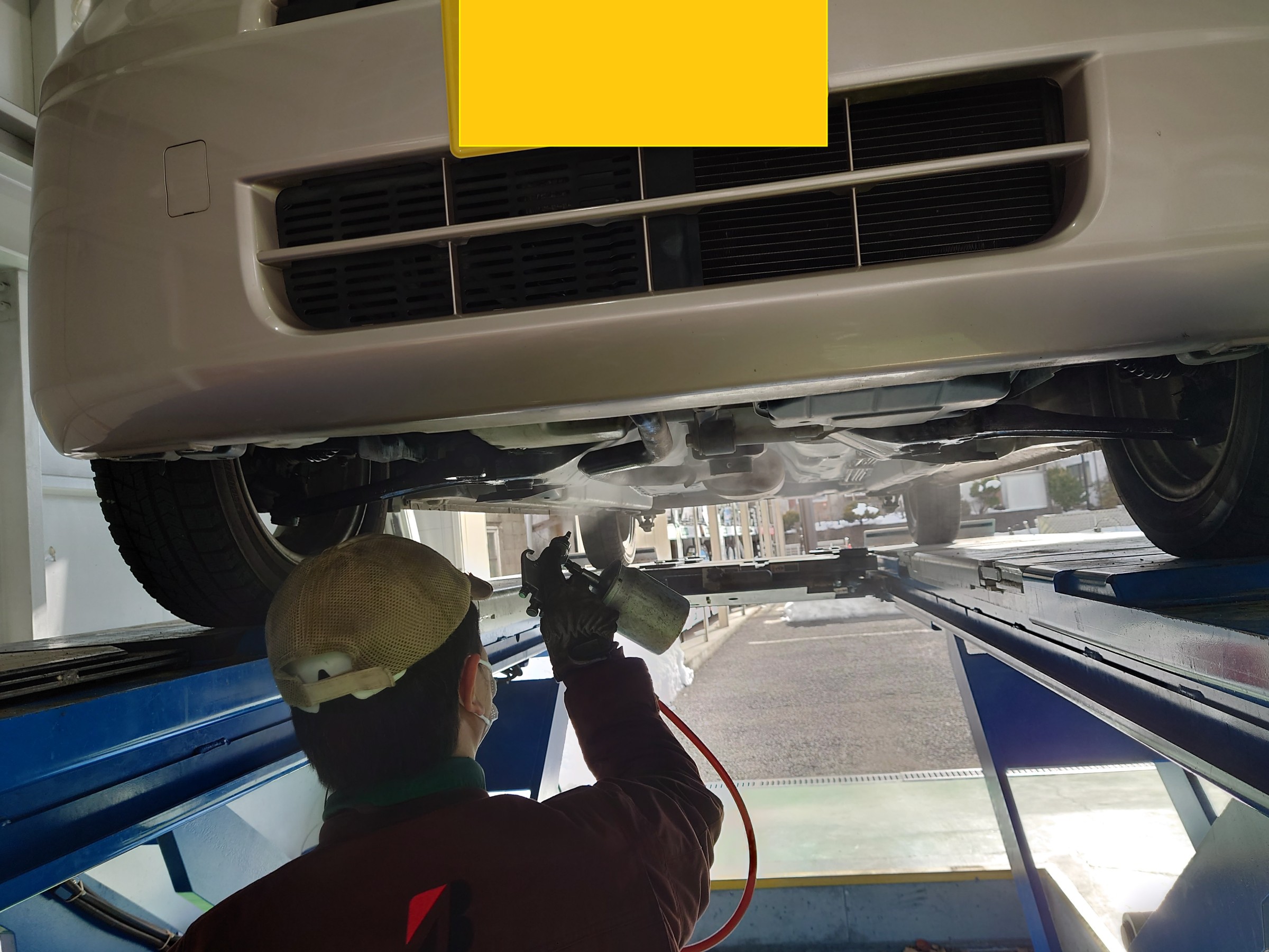 車をリフトで上げ、下回り全体に防錆剤を吹き付けます!(^^)!
