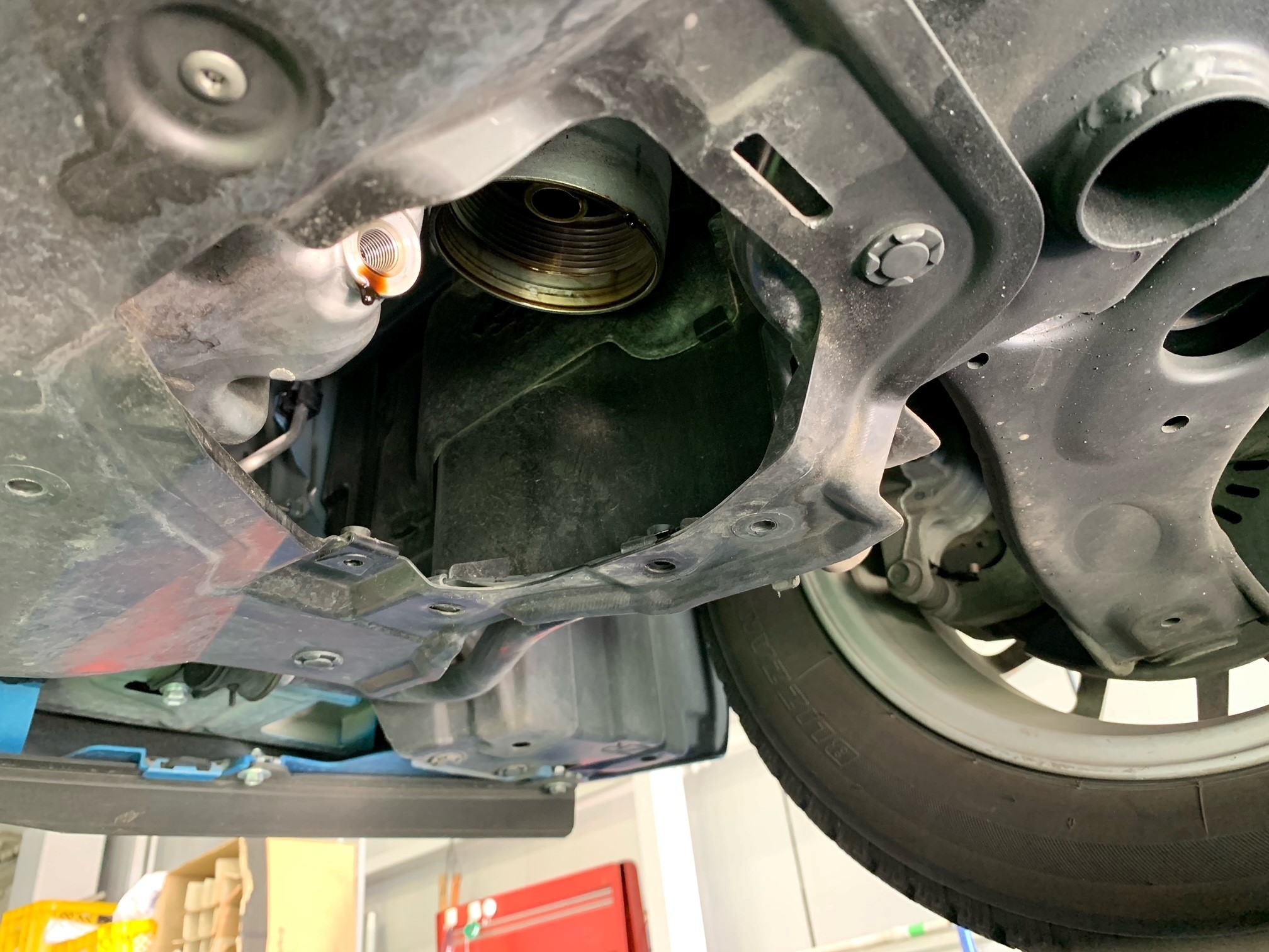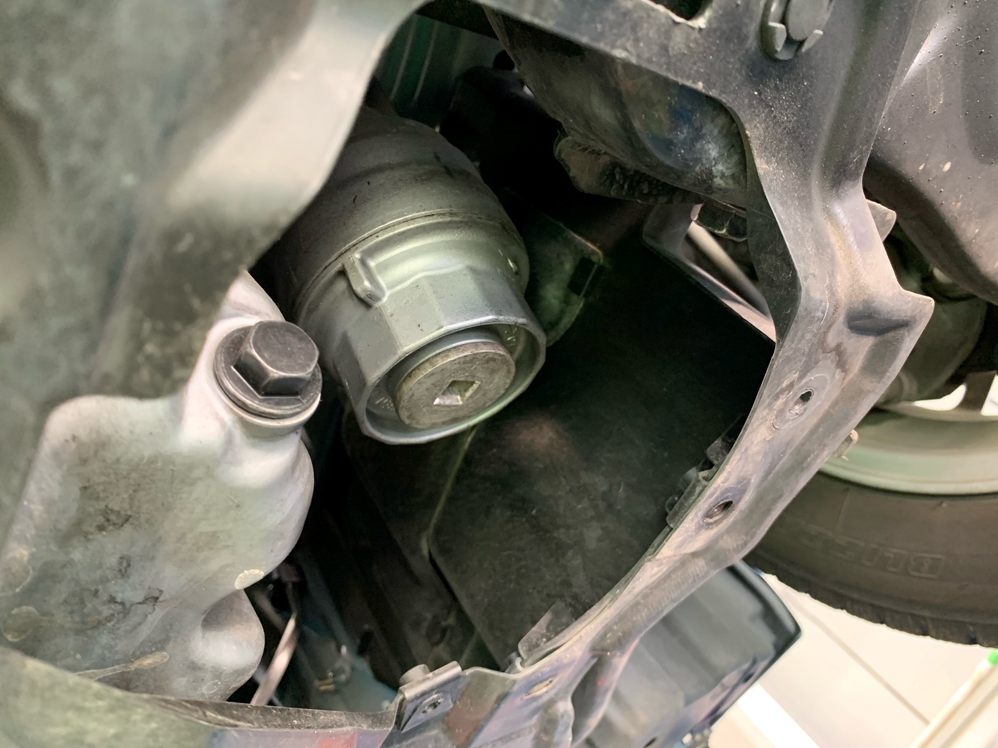 ↓ 手前にエンジンオイルを抜く為のドレンボルトとその奥にオイルフィルターがあります。