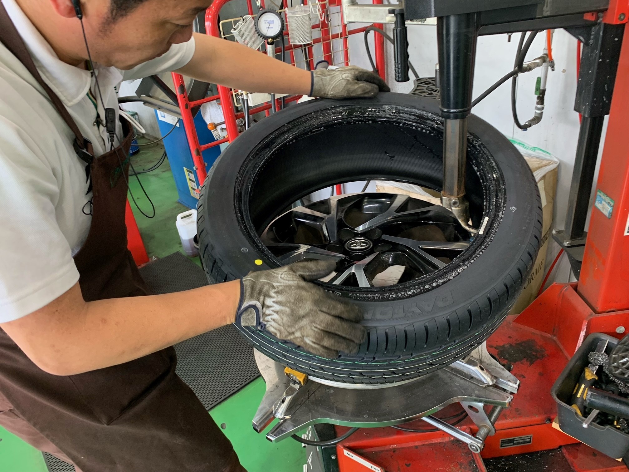↓ 冬タイヤを装着した状態で入庫。積み込んであるホイールにセットします。