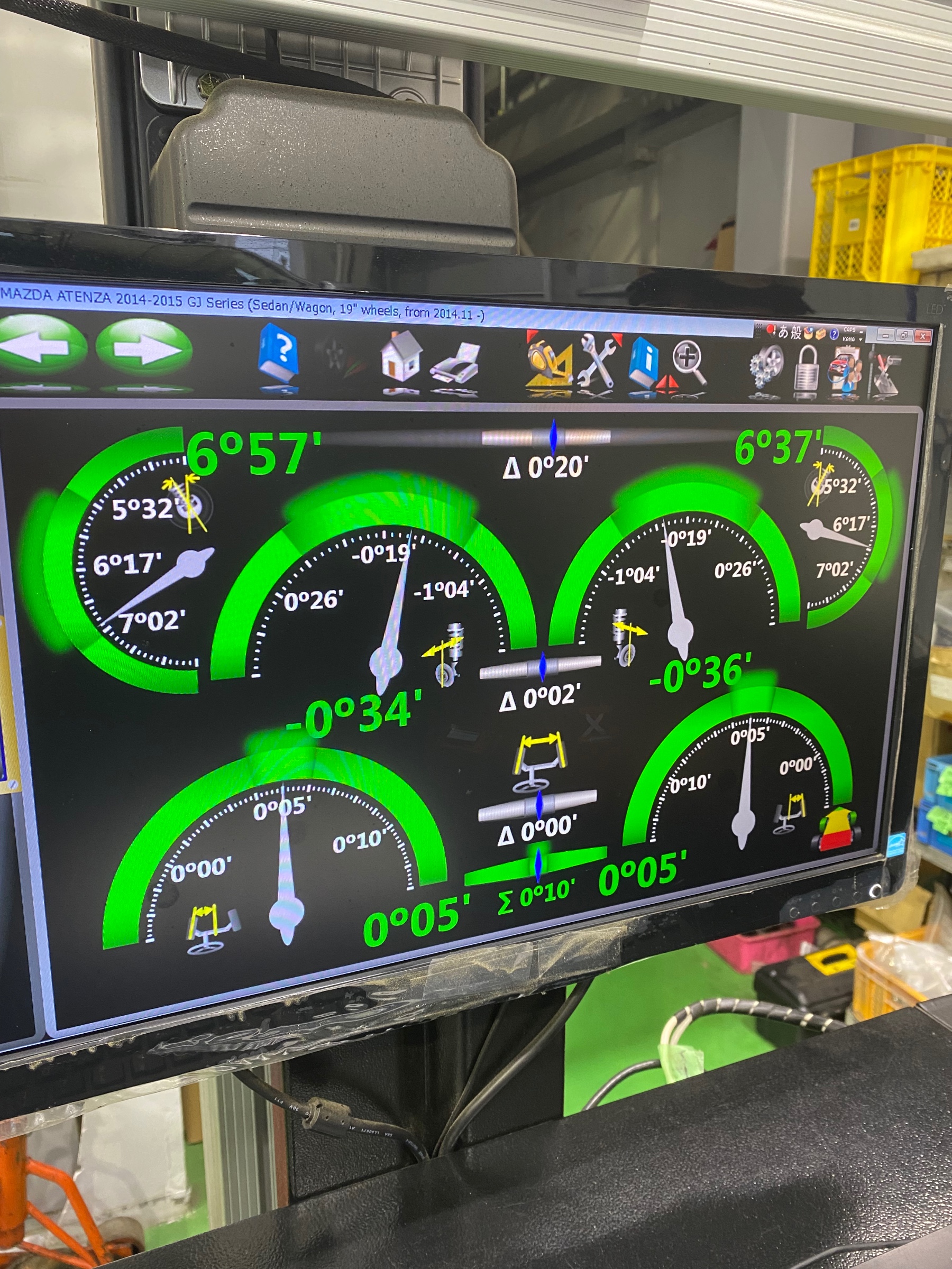 トー角に狂いがありましたので、画像のようなメーターを見ながら基準値へと調整していきます。(画像は調整後のデータです)