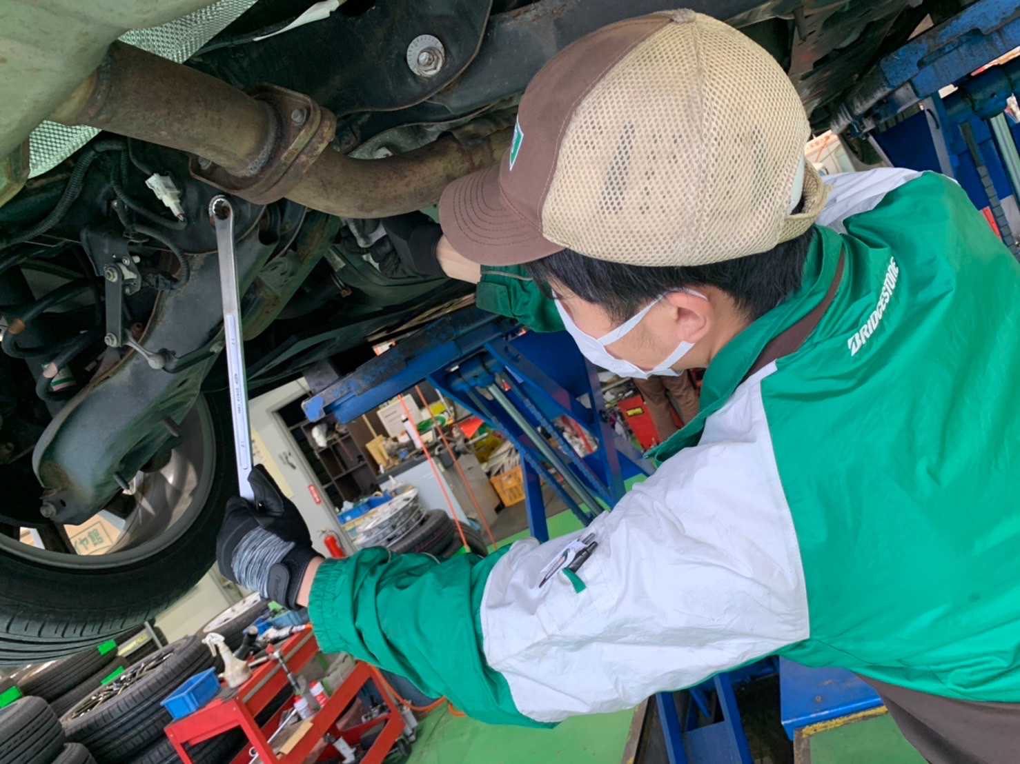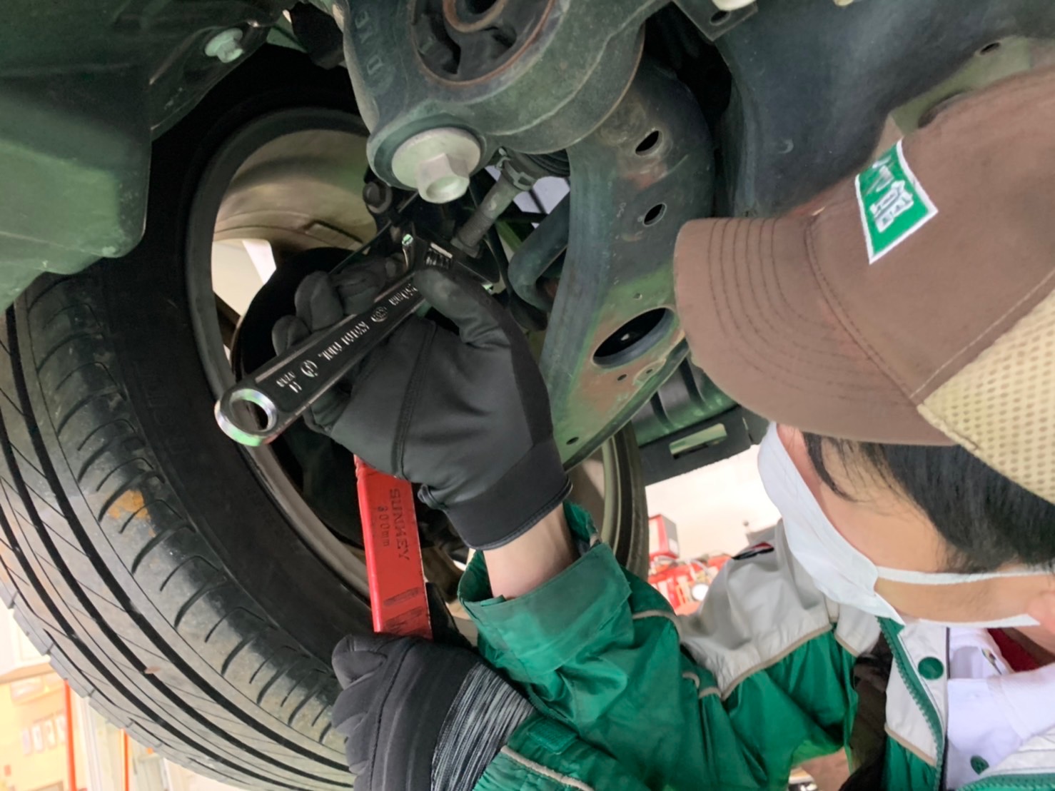 完全に空気が抜けた状態で走行され、足回りへの影響が考えられたためアライメント調整も行います。