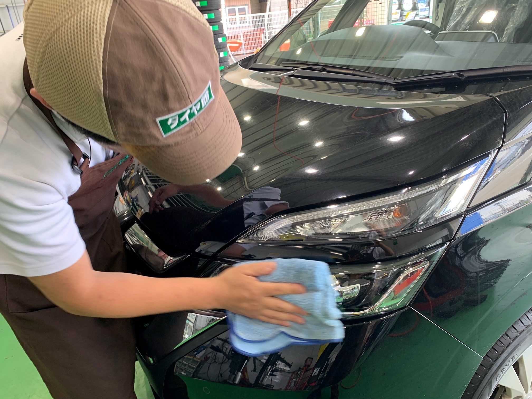 ↓ 西田店長が丁寧にヘッドライトコーティングを実施中です。
