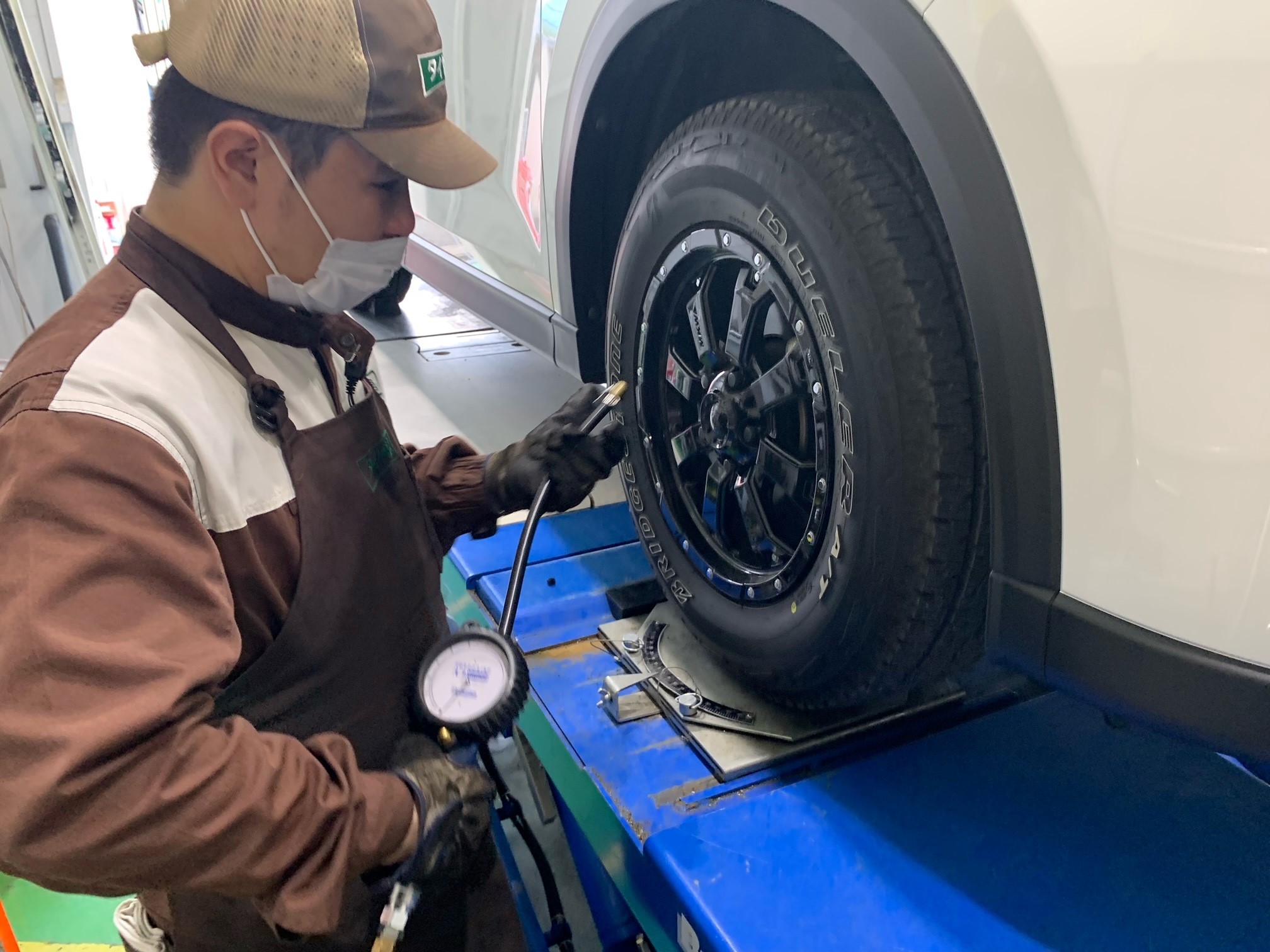 ↓ アライメント測定作業に入る前に必ず空気圧点検を行います。精度の高い測定結果を出す為です。
