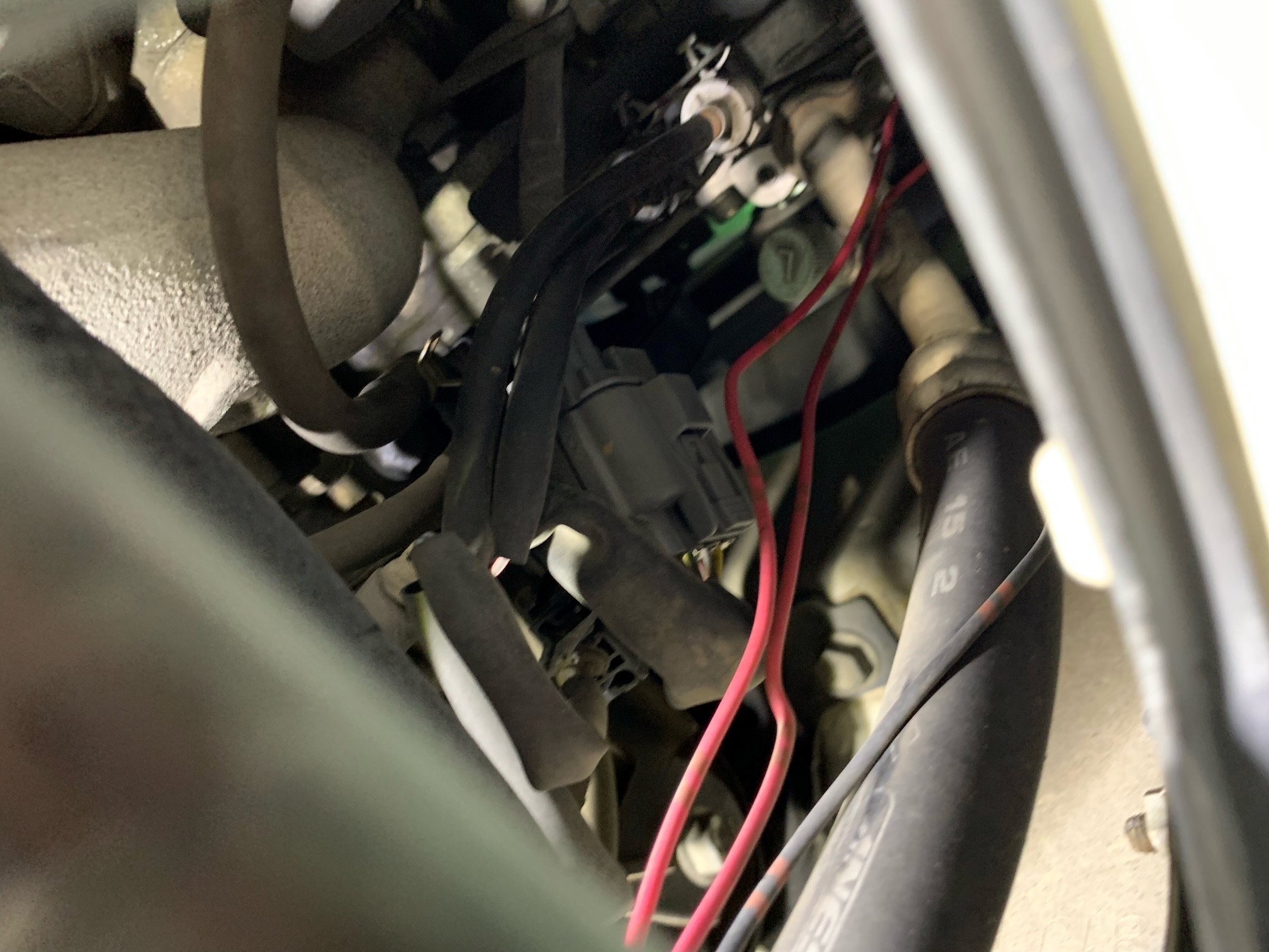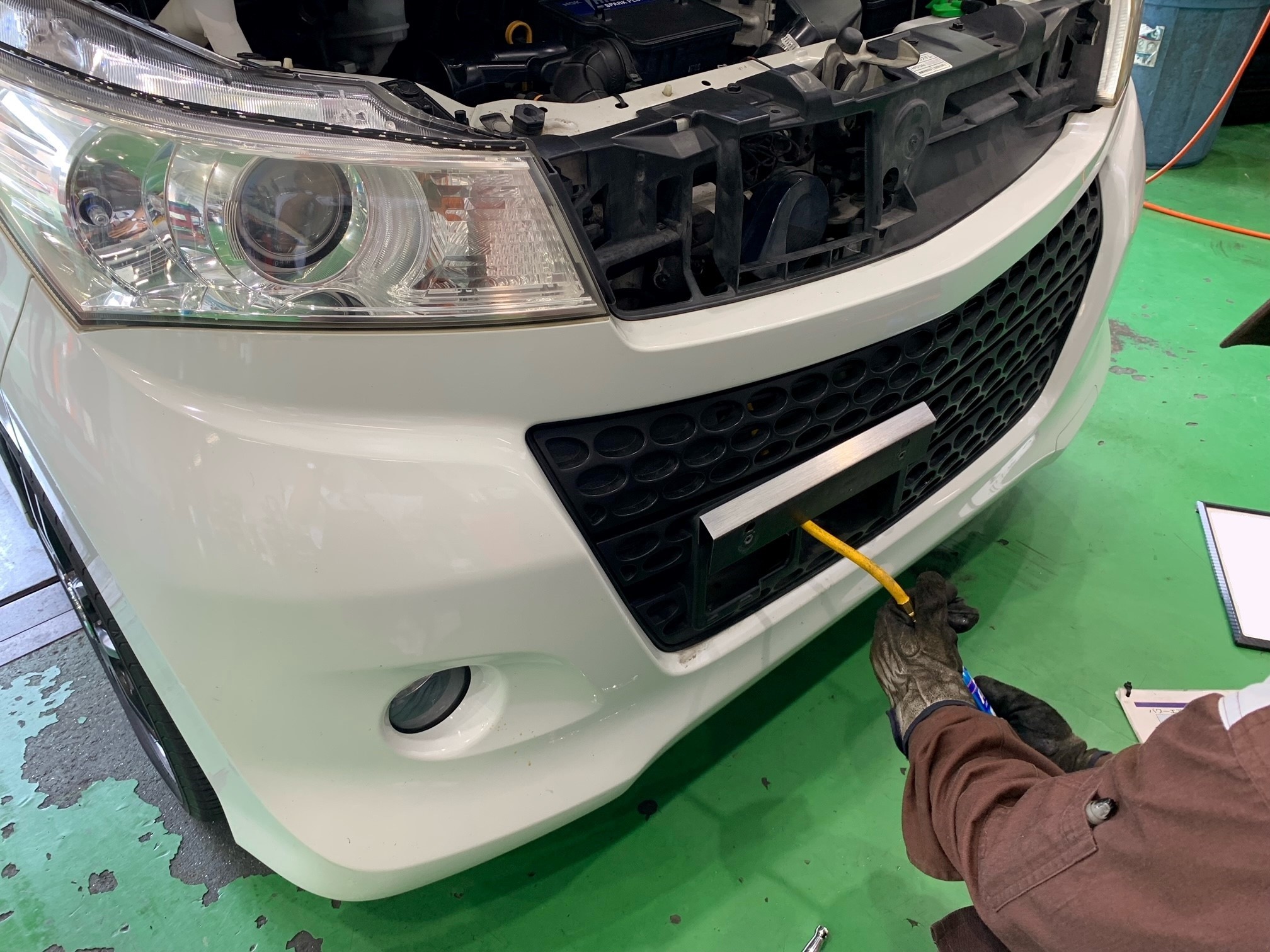 ↓ パレットSWのエアコン添加剤注入口はフロントバンパーの後ろにあります。