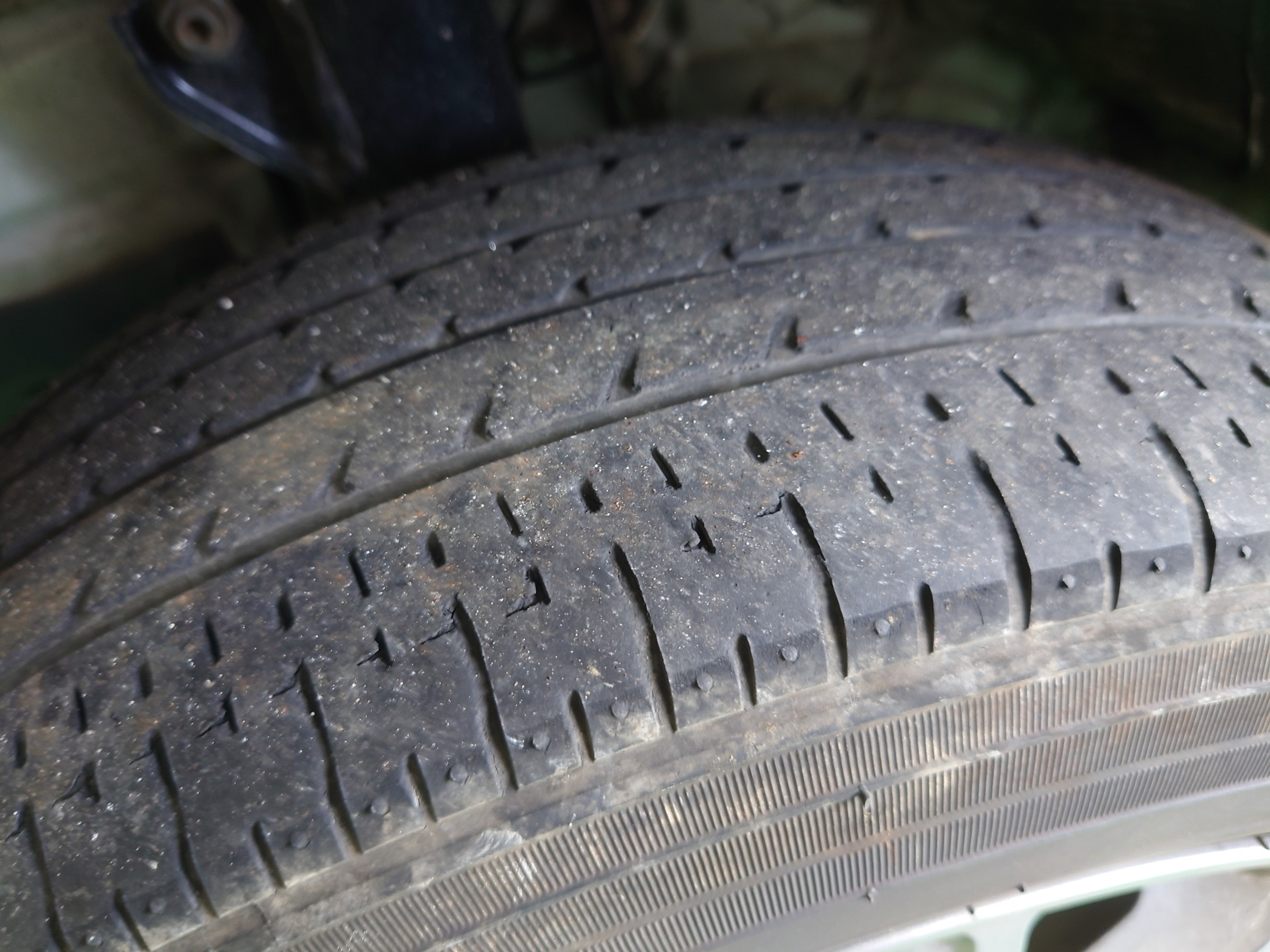 新車装着のタイヤは、溝も減り、ヒビも入りはじめてました。