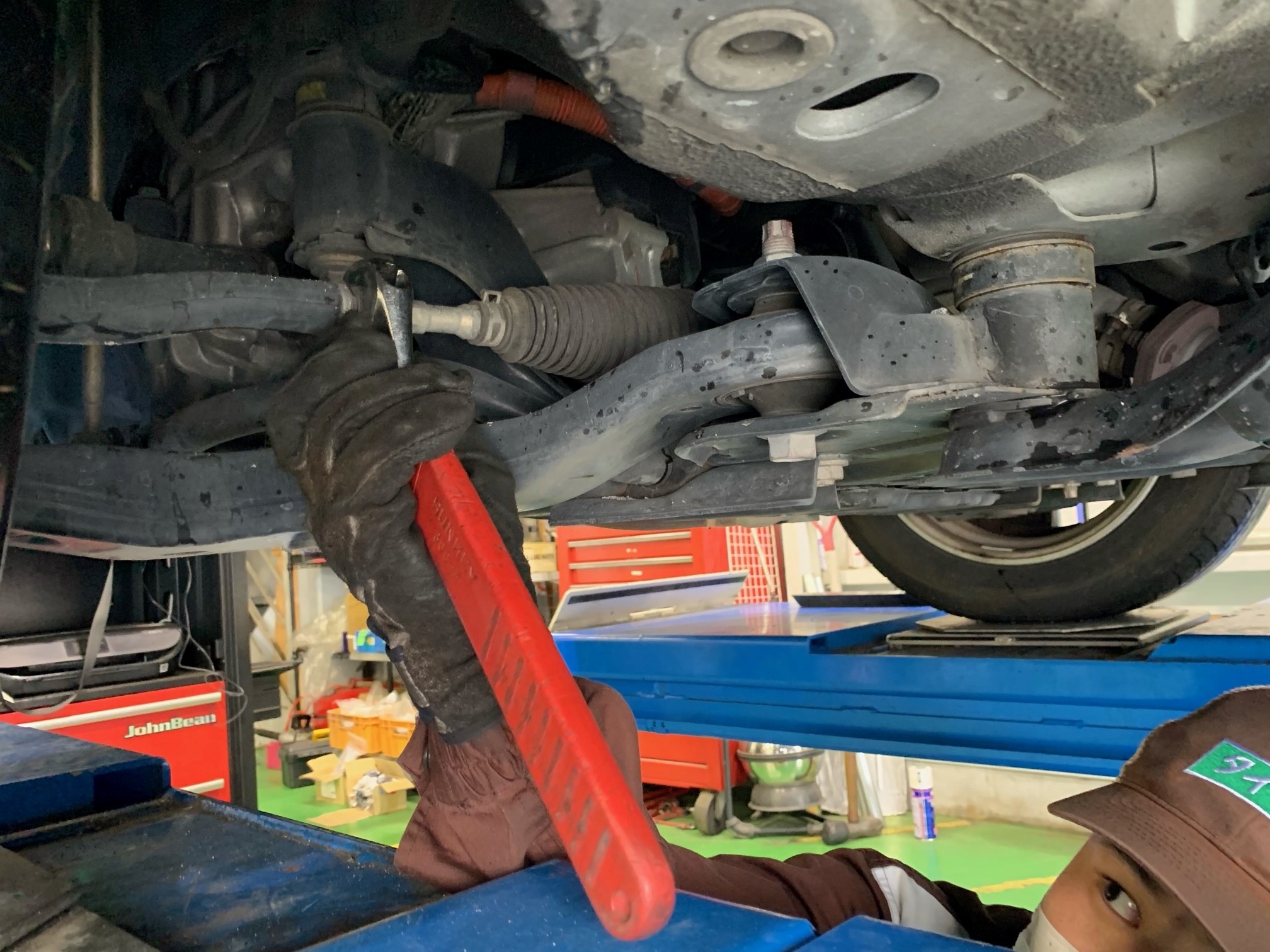 ↓ 調整は刑部スタッフが担当。タイロッドについてるネジを回し、伸ばしていきます。