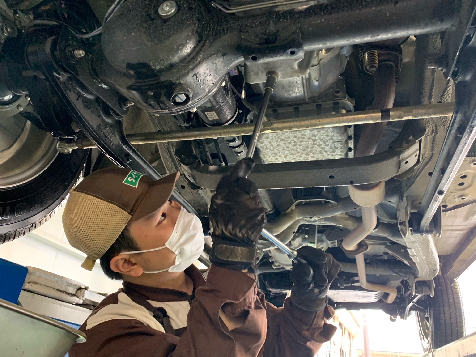 ↓ オイル交換は刑部スタッフが担当しました。ジムニーをこよなく愛する刑部スタッフなら安心ですね。