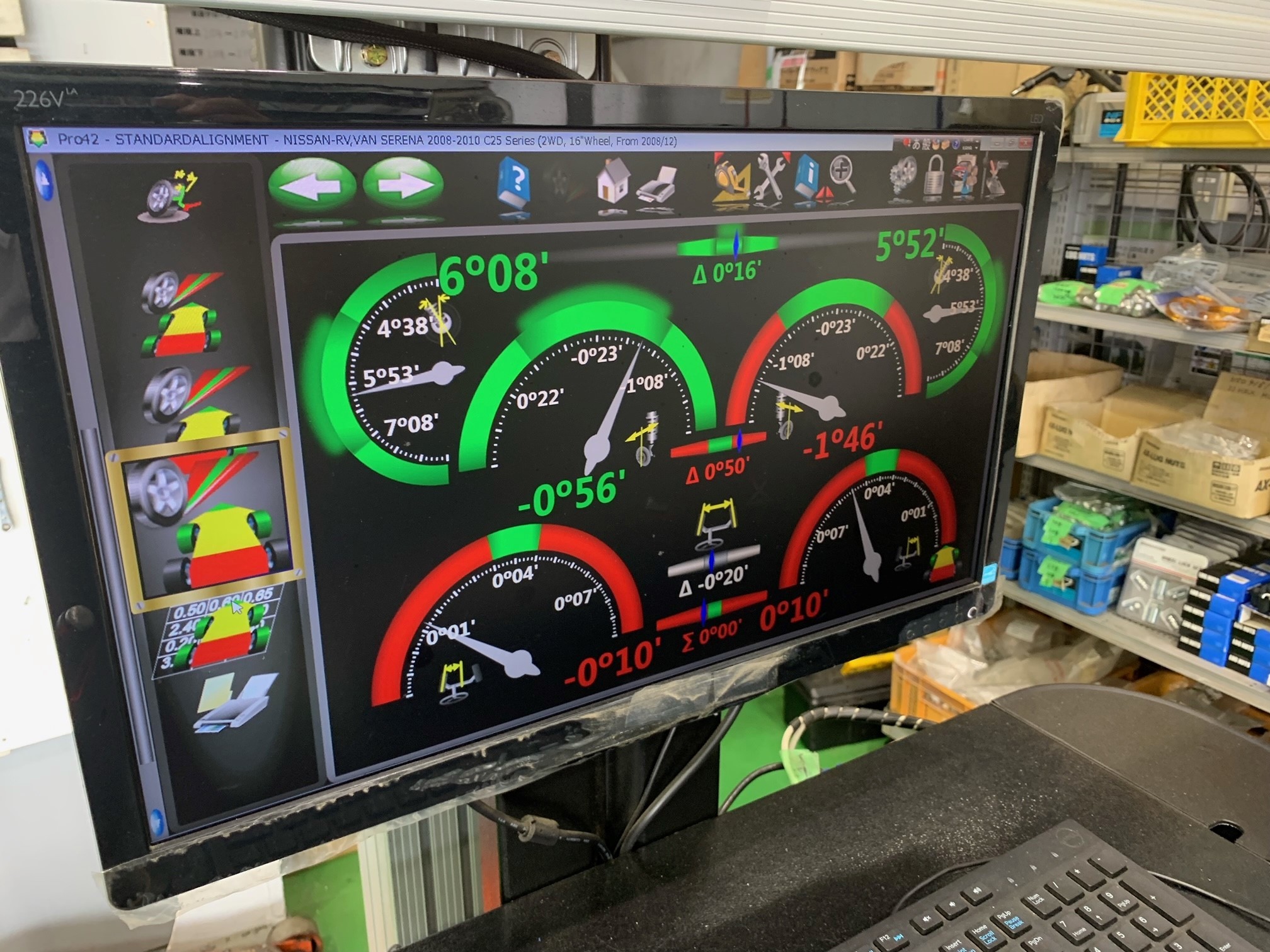 ↓ こちらがそのアライメント測定データです。(フロントタイヤのデータ)赤いメーターの指針が右も左も左に傾いているのがわかります。 これが原因ですね。