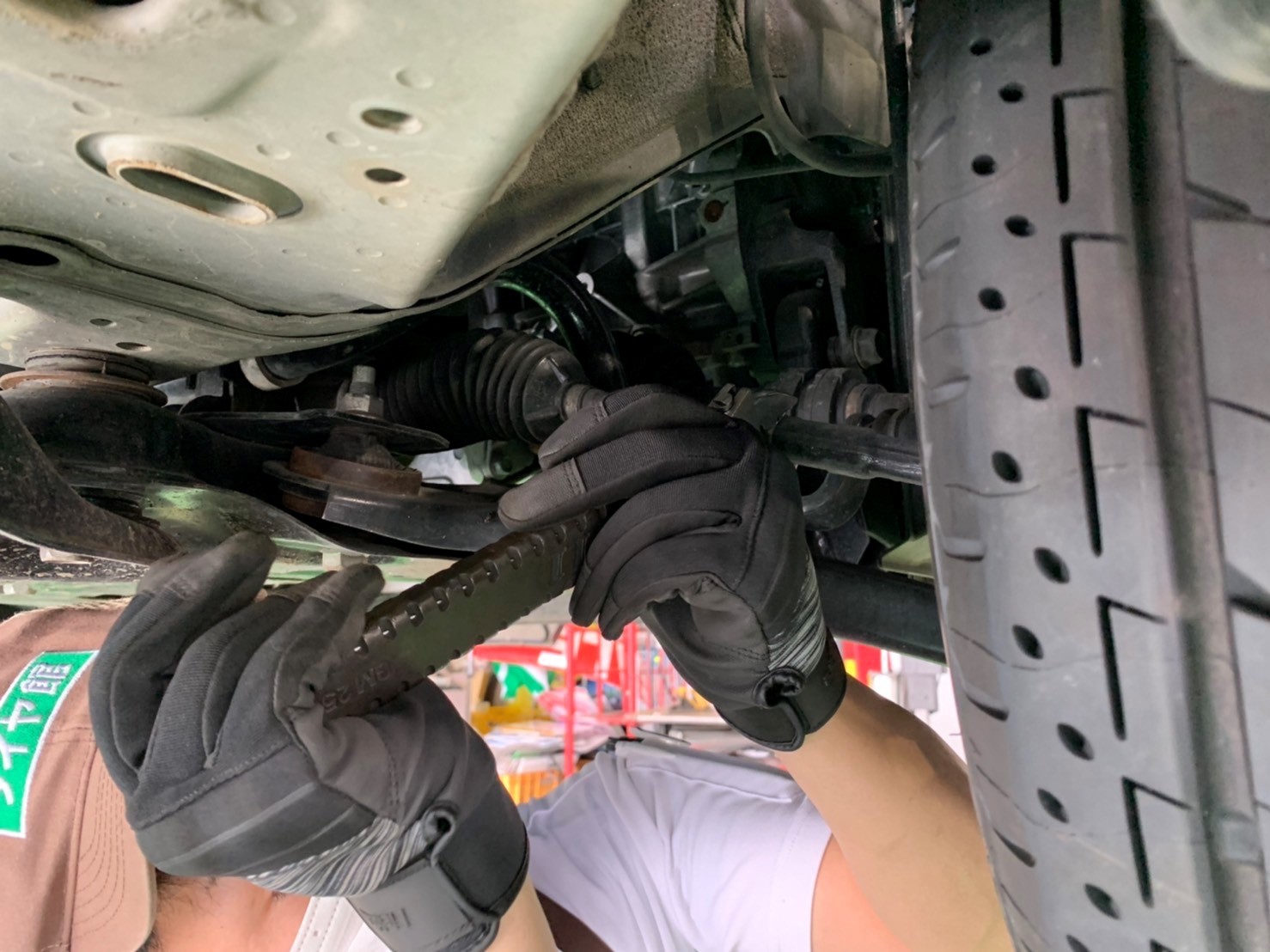 交換前のタイヤに偏摩耗(偏った擦り減りが起きている状態)が見られましたのでアライメント測定&調整を実施した所、左フロントのトー角が外側に開いている状態でした。