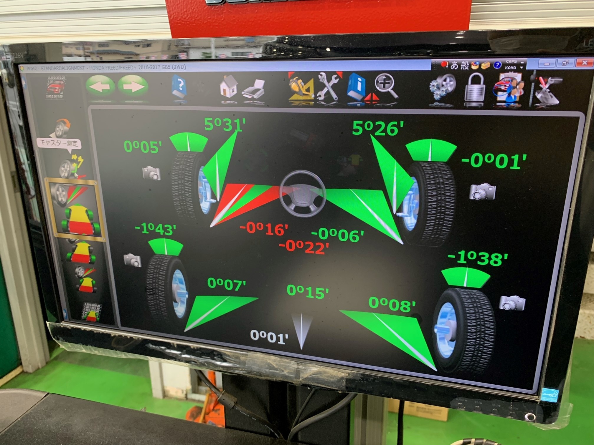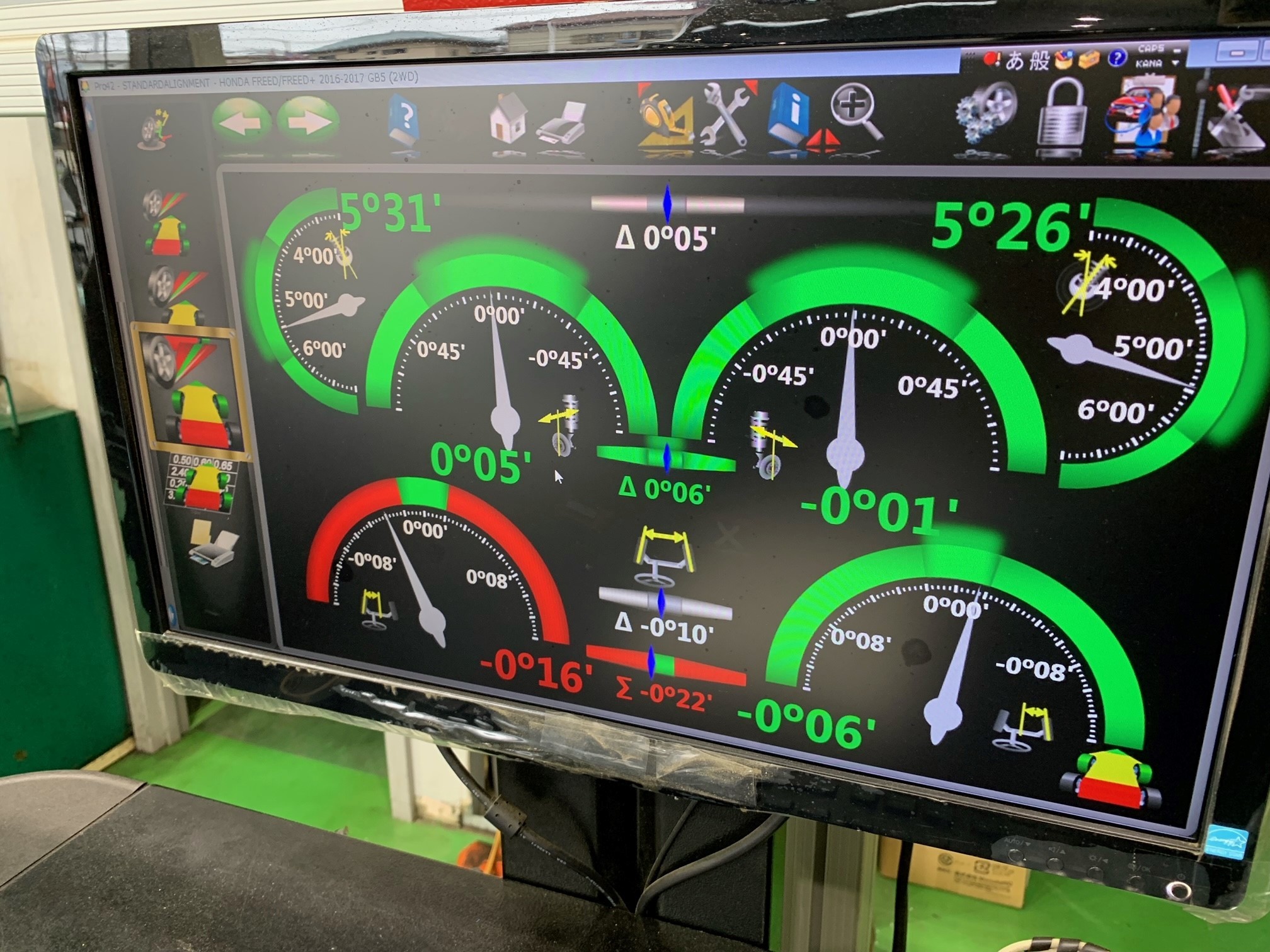 ↓ 左前のタイヤを縁石に乗り上げている為か、左前のメーターが基準値外を示しております。