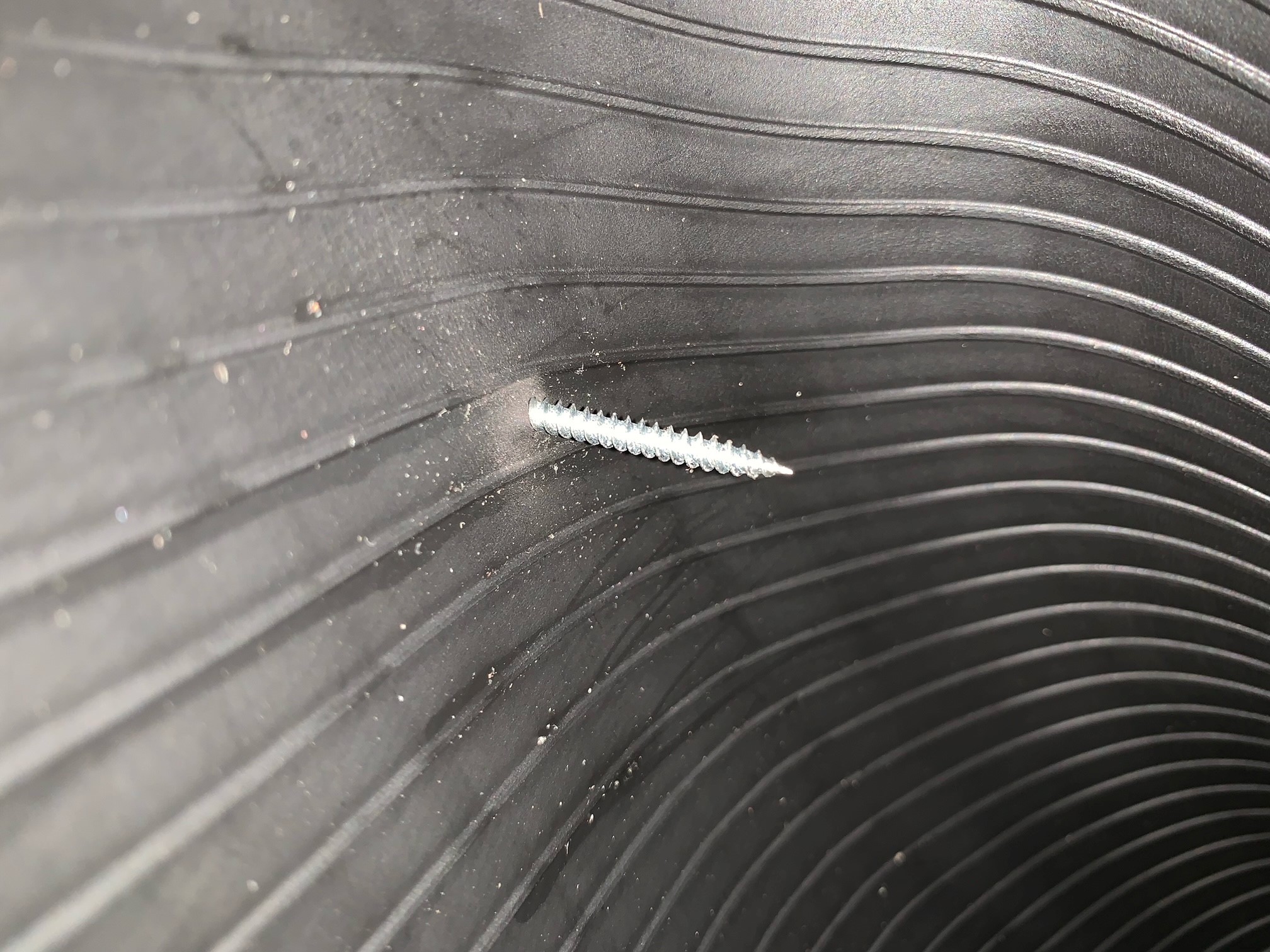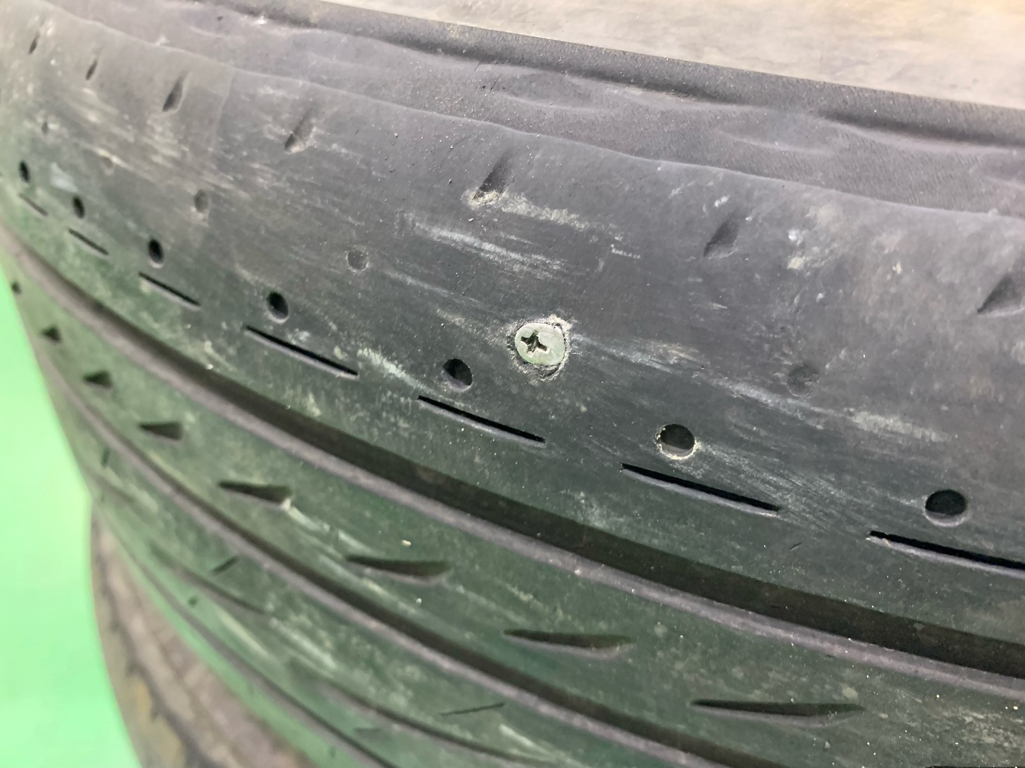 ↓ こちらが問題のパンク箇所です。ガッツリとネジが刺さってますね。