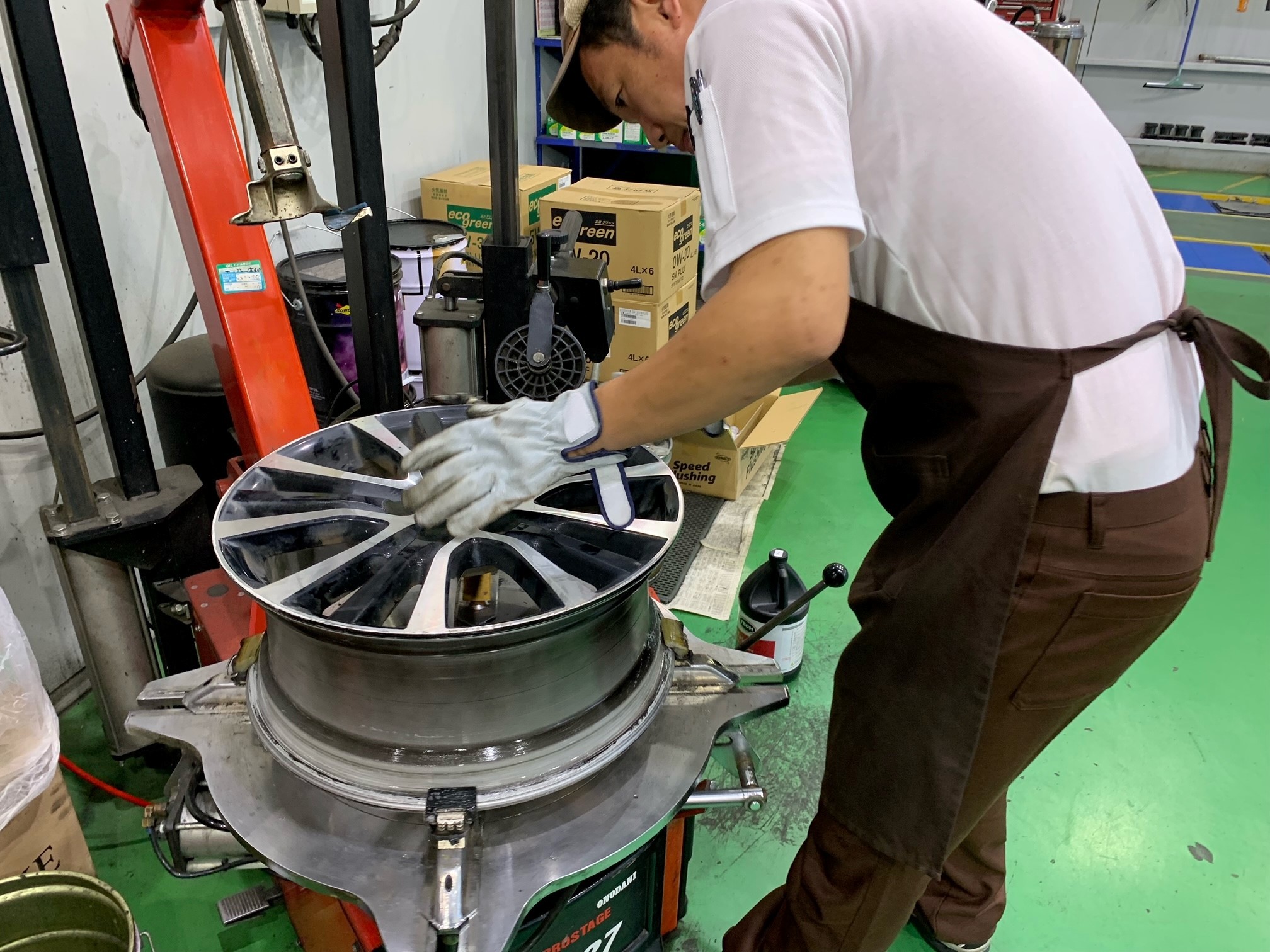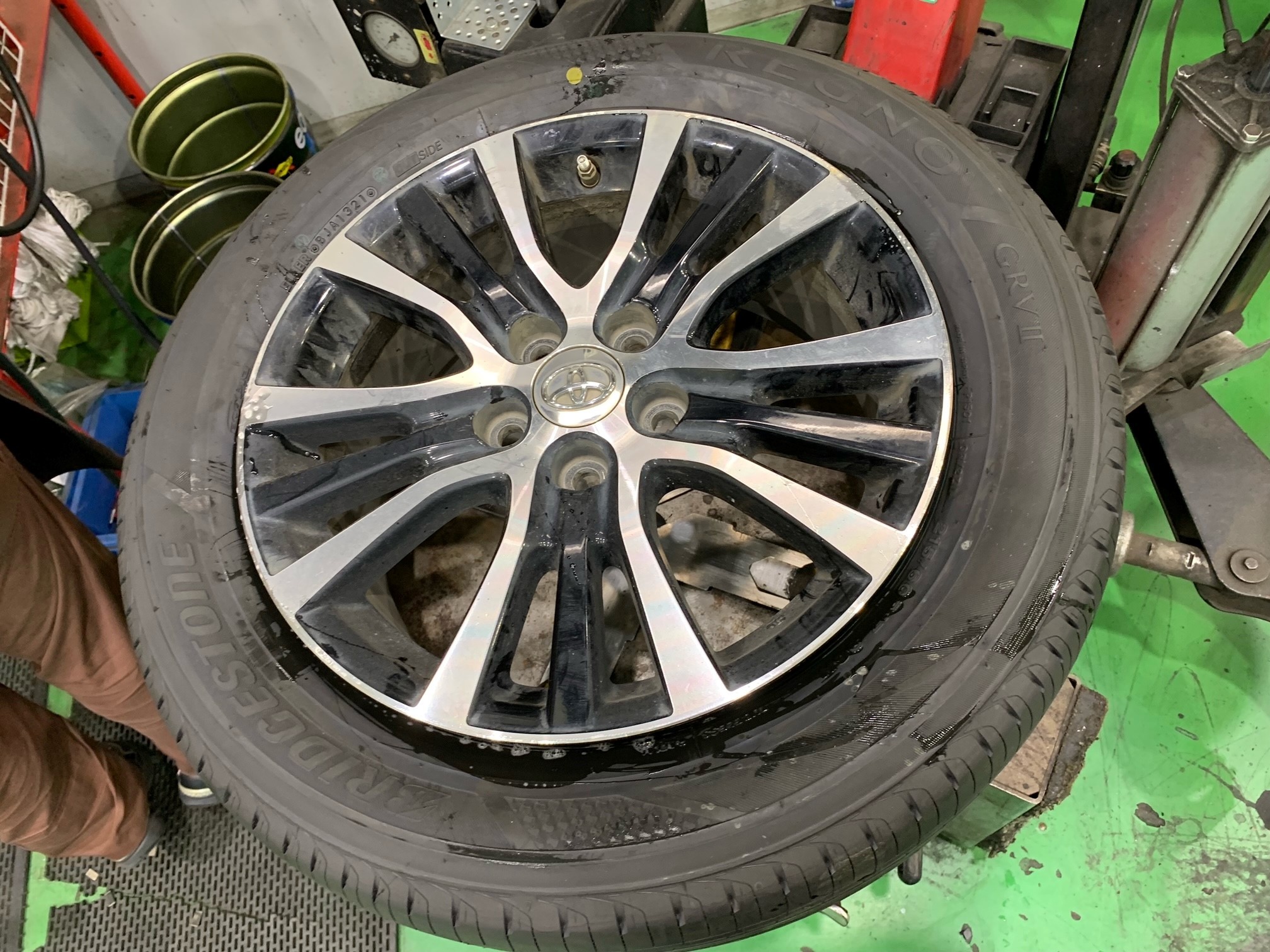 ↓ タイヤを新たに交換する事になりました。交換は西田店長と刑部スタッフが担当です。