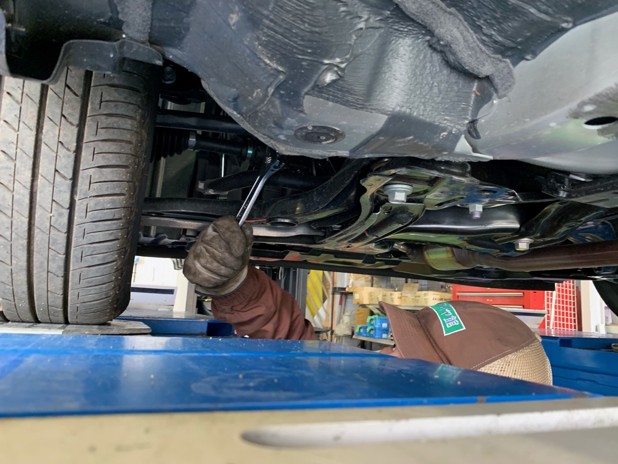 ↓ アライメント調整は刑部スタッフが担当。まだ新しいお車なので下回りが綺麗ですね。調整も簡単そうです。