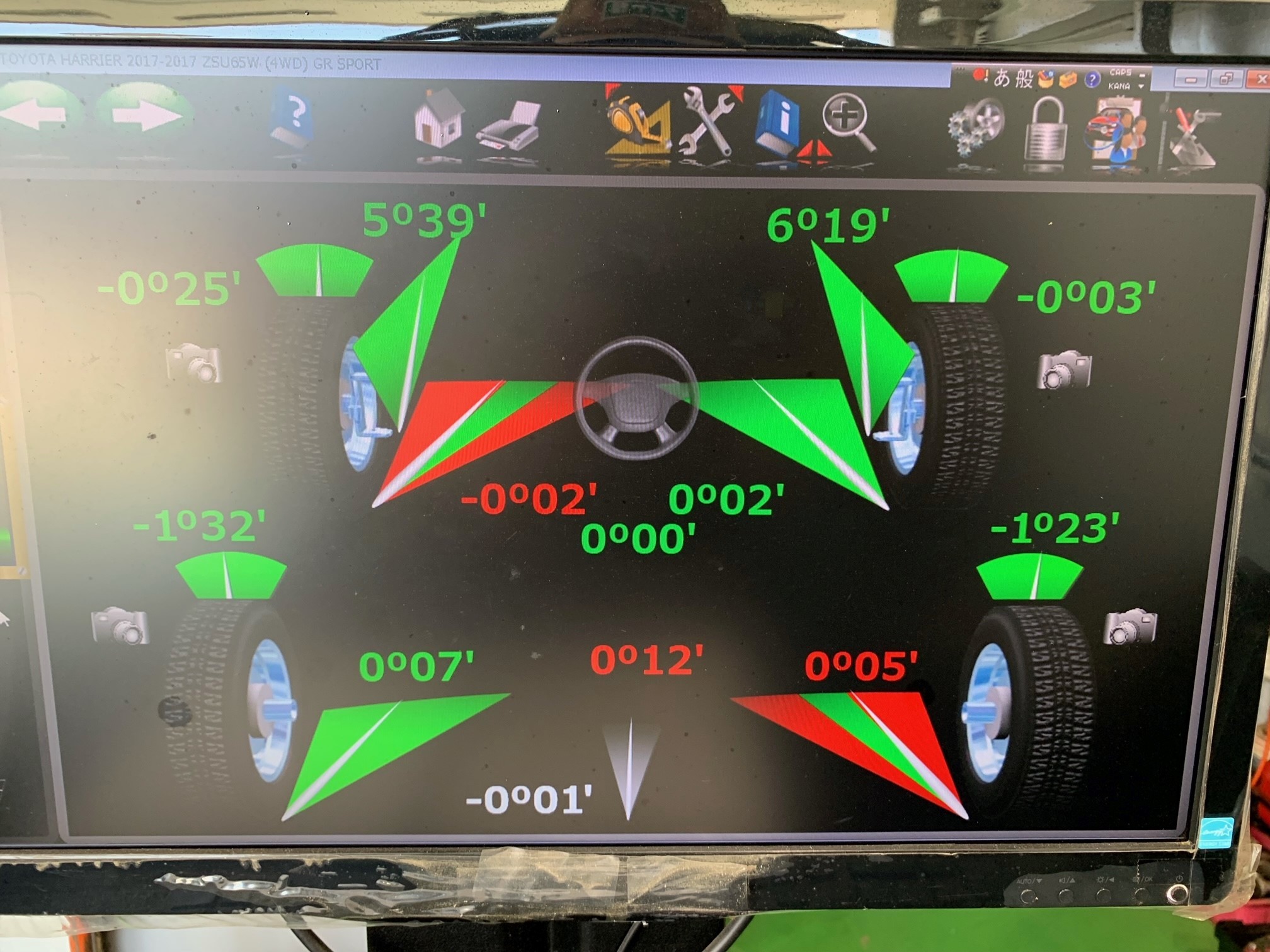 ↓ 仕上げにアライメント調整もさせて頂きました。測定データを見ると左前と右後ろのタイヤがズレているのが分かります。