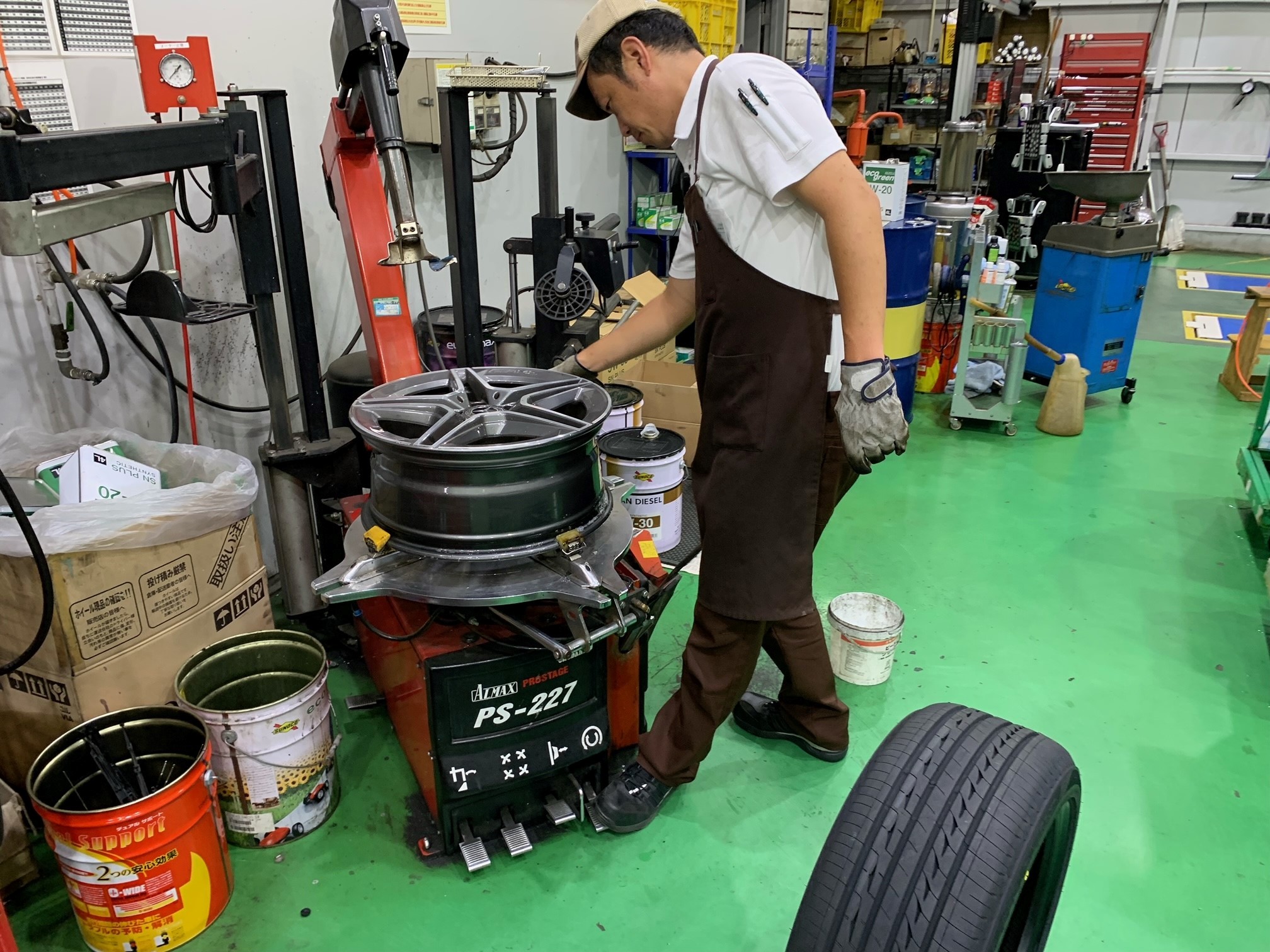 低扁平タイヤはしっかりとしたタイヤチェンジャーとそれを扱えるスタッフがいて組み替える事ができます。当店にはそんなベテランスタッフが豊富におりますので安心して作業をお任せください!