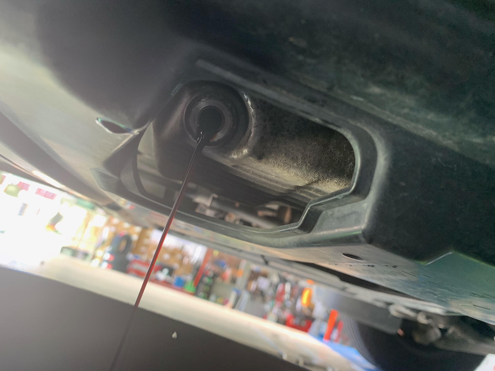 オイルパンからエンジンオイルを抜いている作業