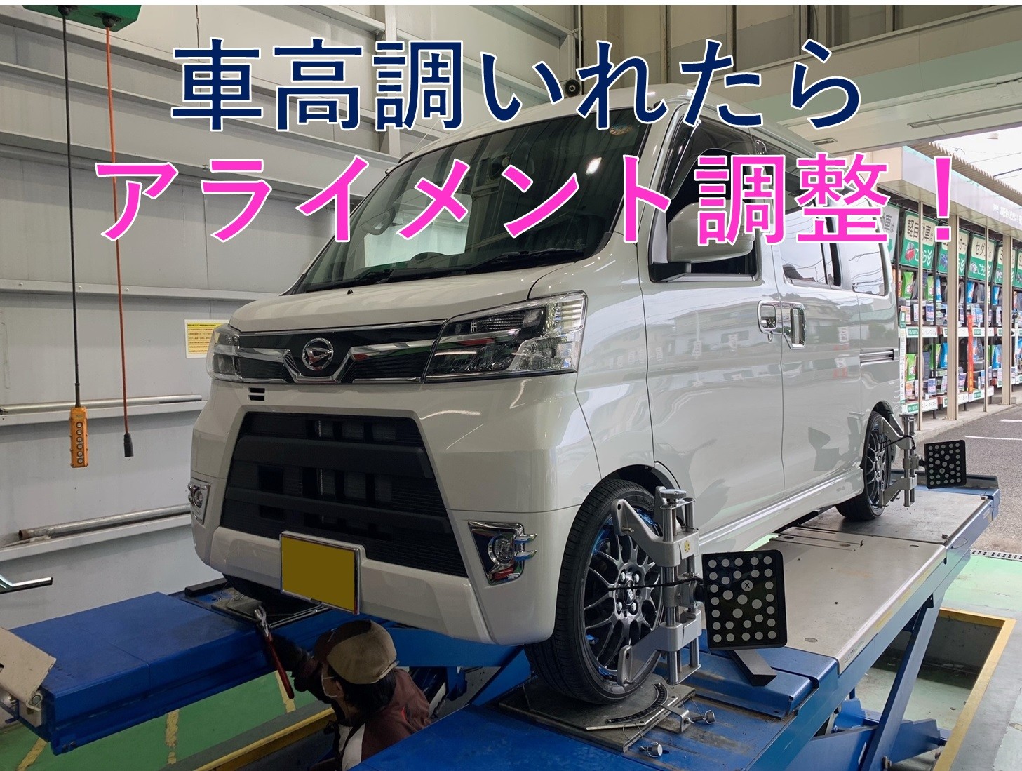 今日お客様がアライメント調整で来店された理由は、アトレーに車高調を取り付けたので、