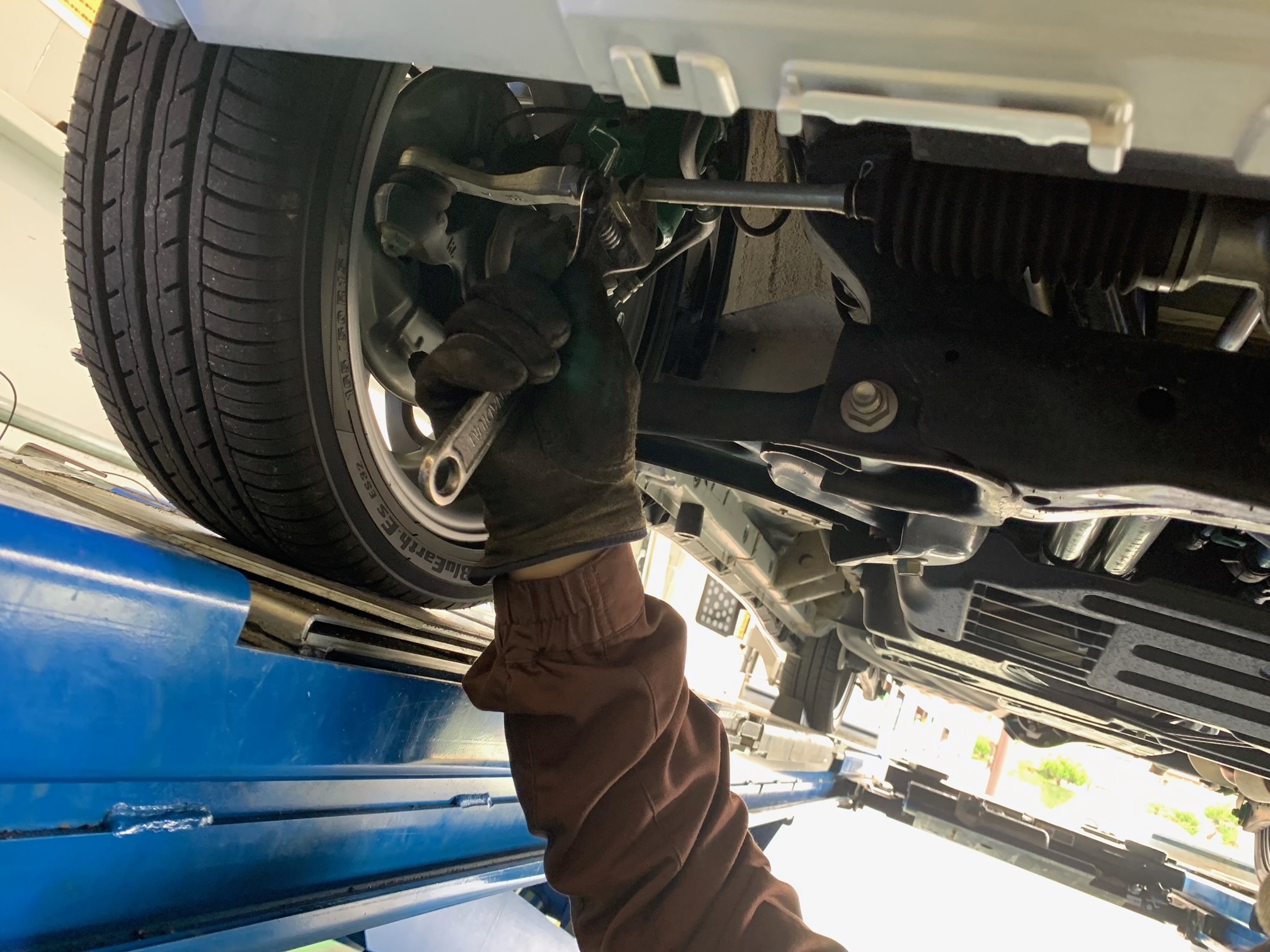 今回は左前のタイヤが大きくズレており、ハンドルの操作にも影響が出るほどでした。