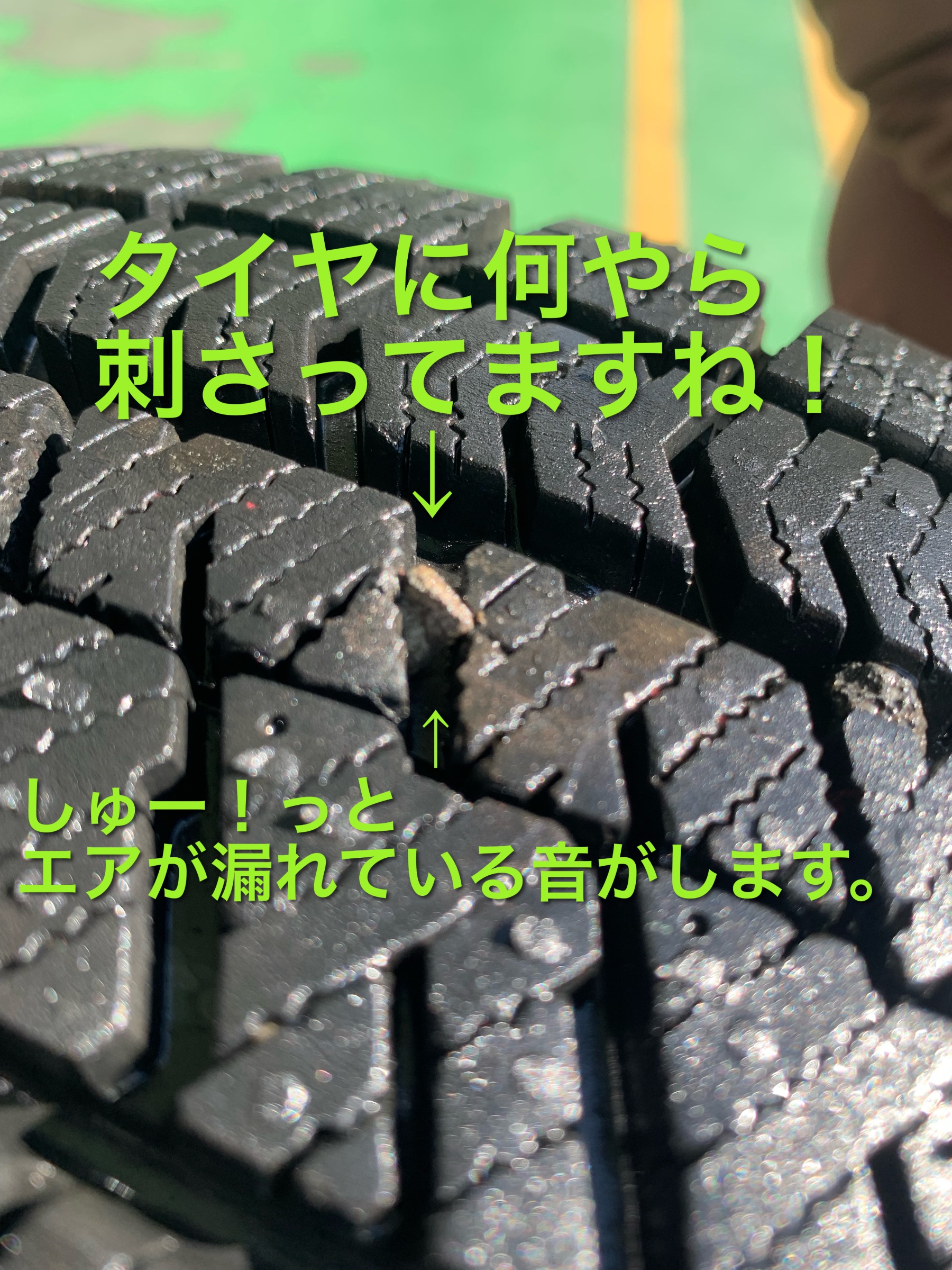 ↓ タイヤの空気圧が減るという事で来店してくださいました。タイヤをチェックしてみると何やら「シュー!」って音が聞こえます。