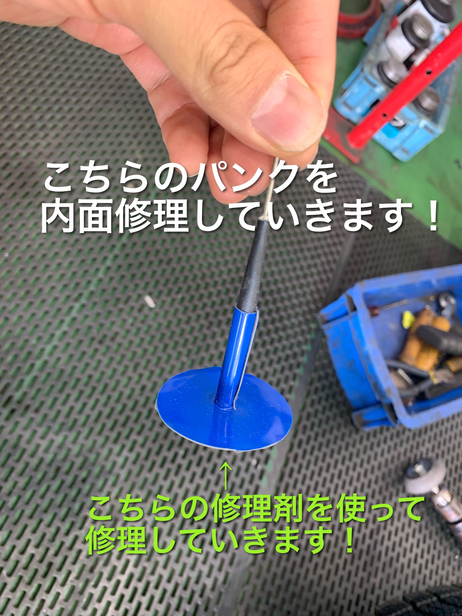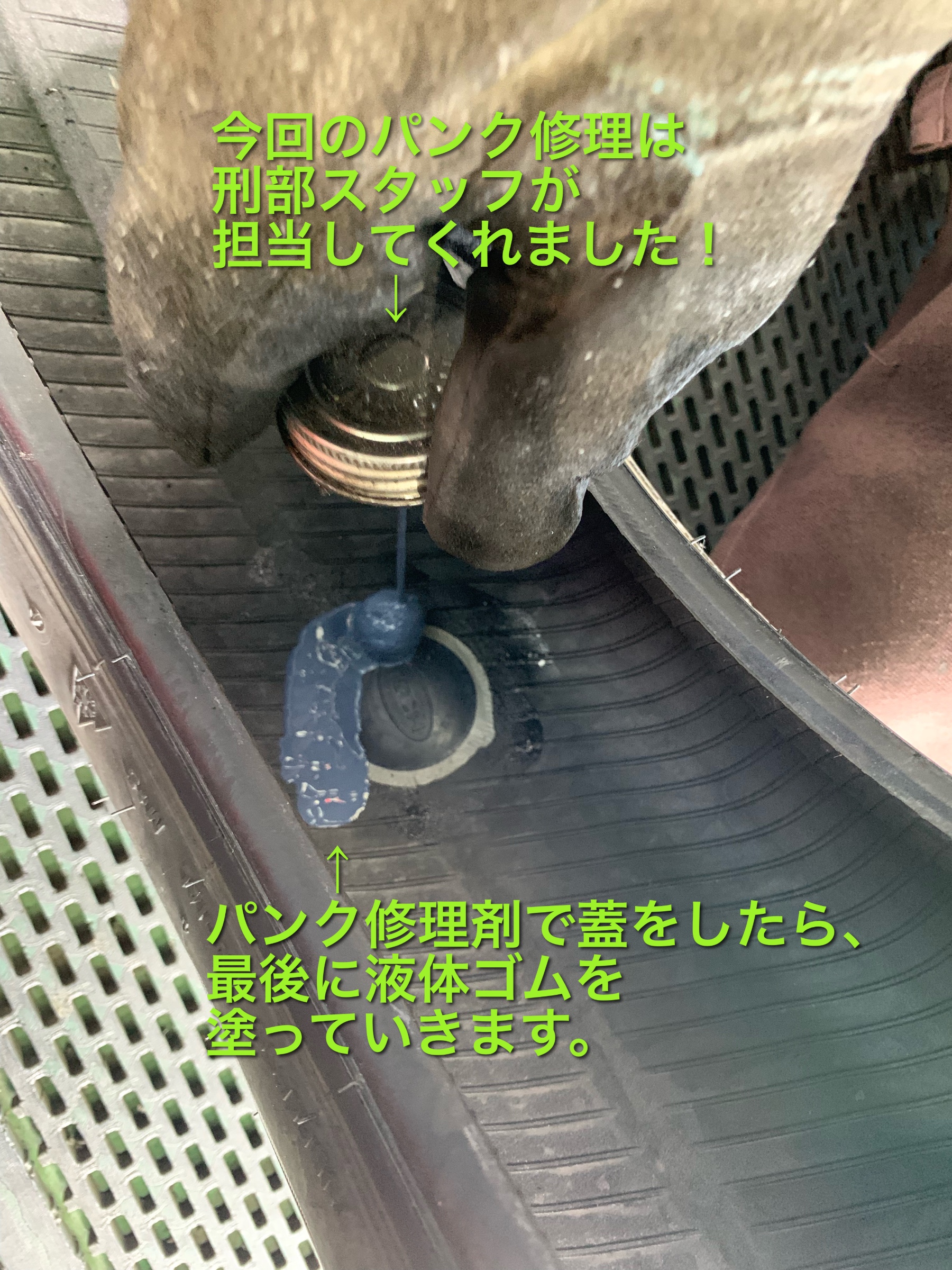 ↓ 専用のパンク修理材で蓋をしたらその上から液体ゴムを塗っていきます。これで完璧です。