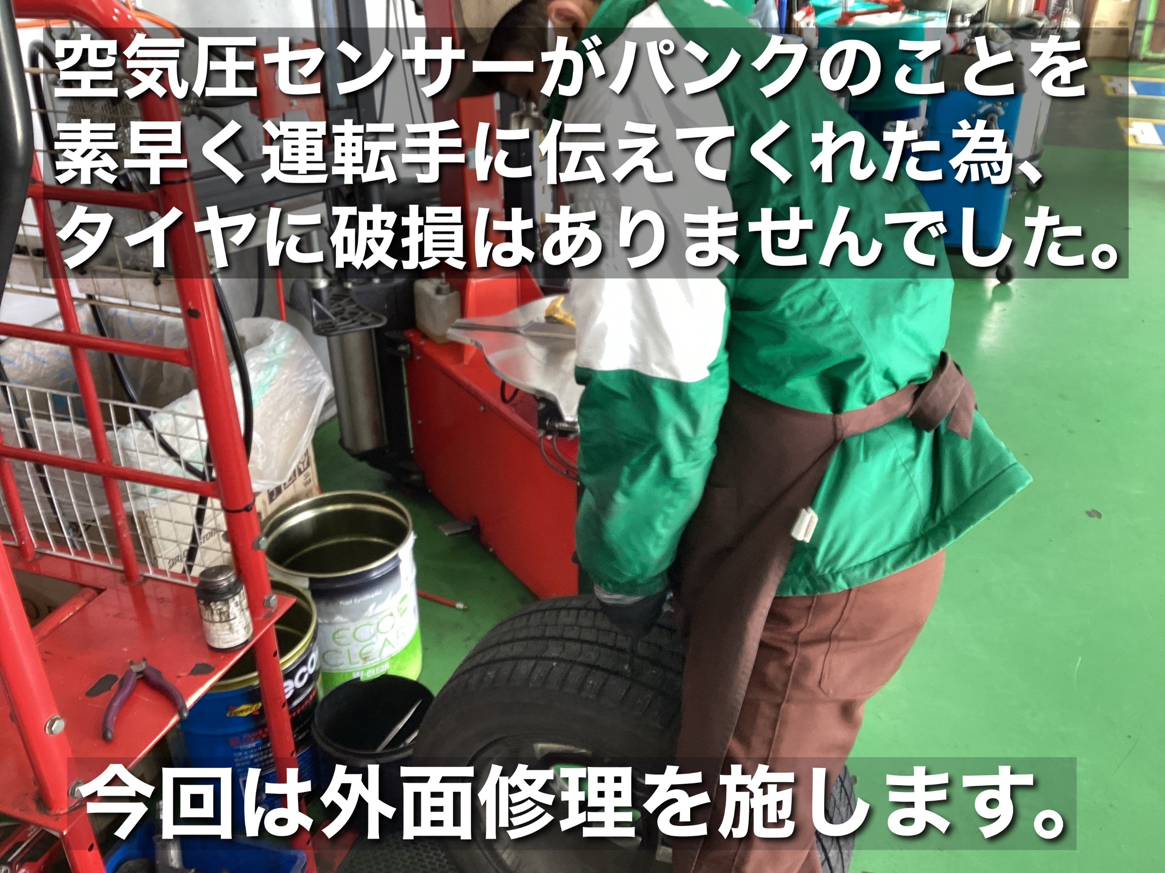 ↓ 社内の空気圧センサーがドライバーにパンクの事を速やかに伝えてくれた為、安全に入庫しパンク修理する事ができました。